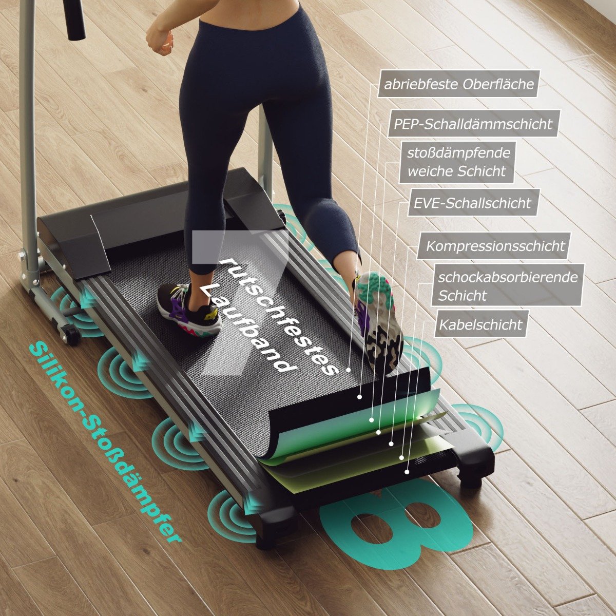 • Saugiai ir patogiai sportuosite dėka 7 sluoksnių neslystančios juostos ir amortizavimo sistemos.