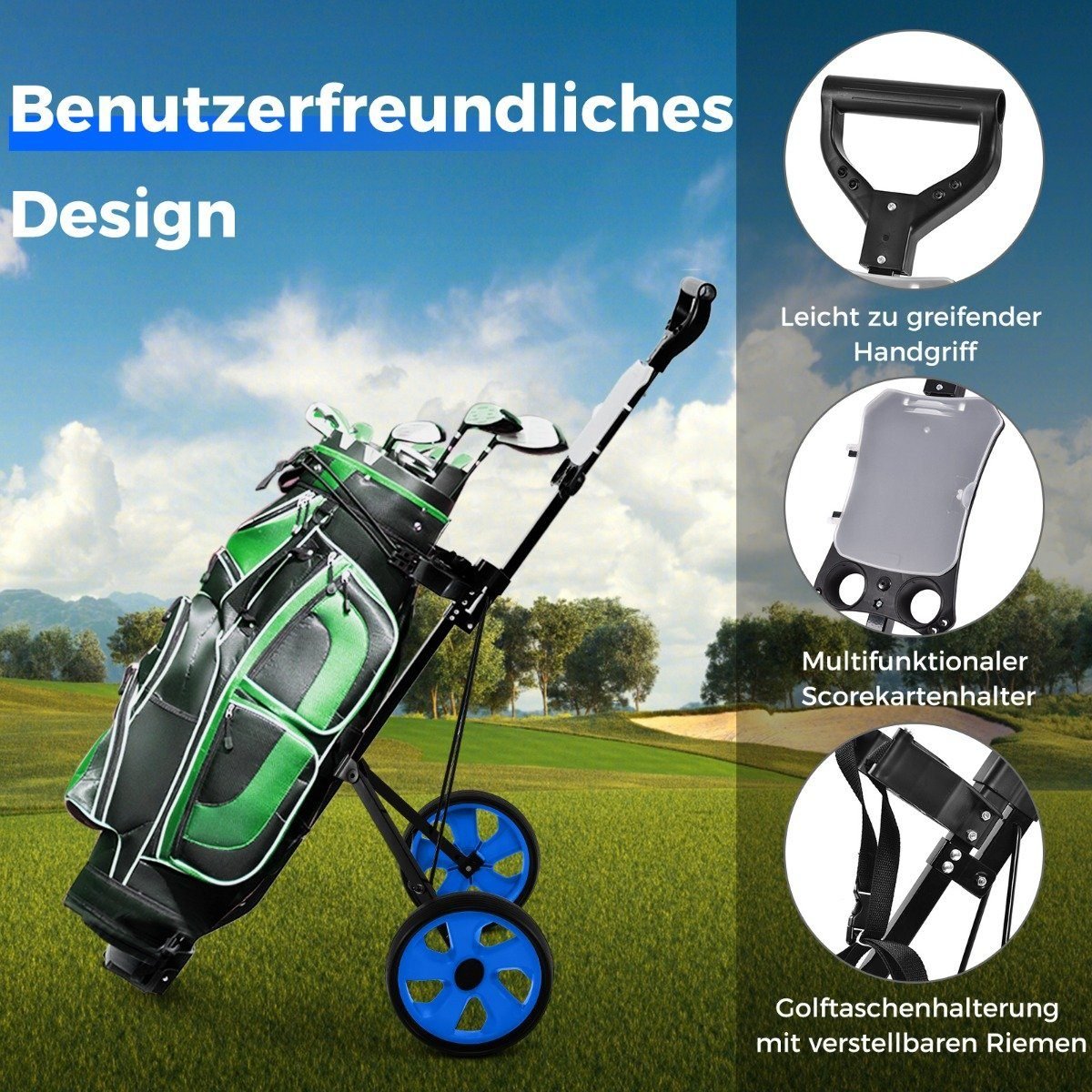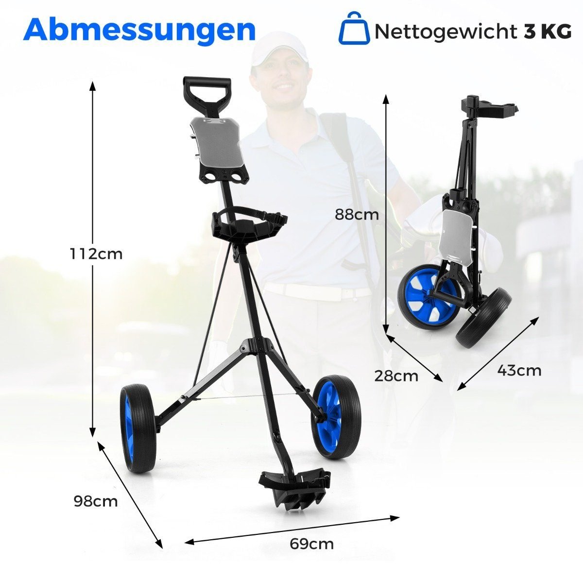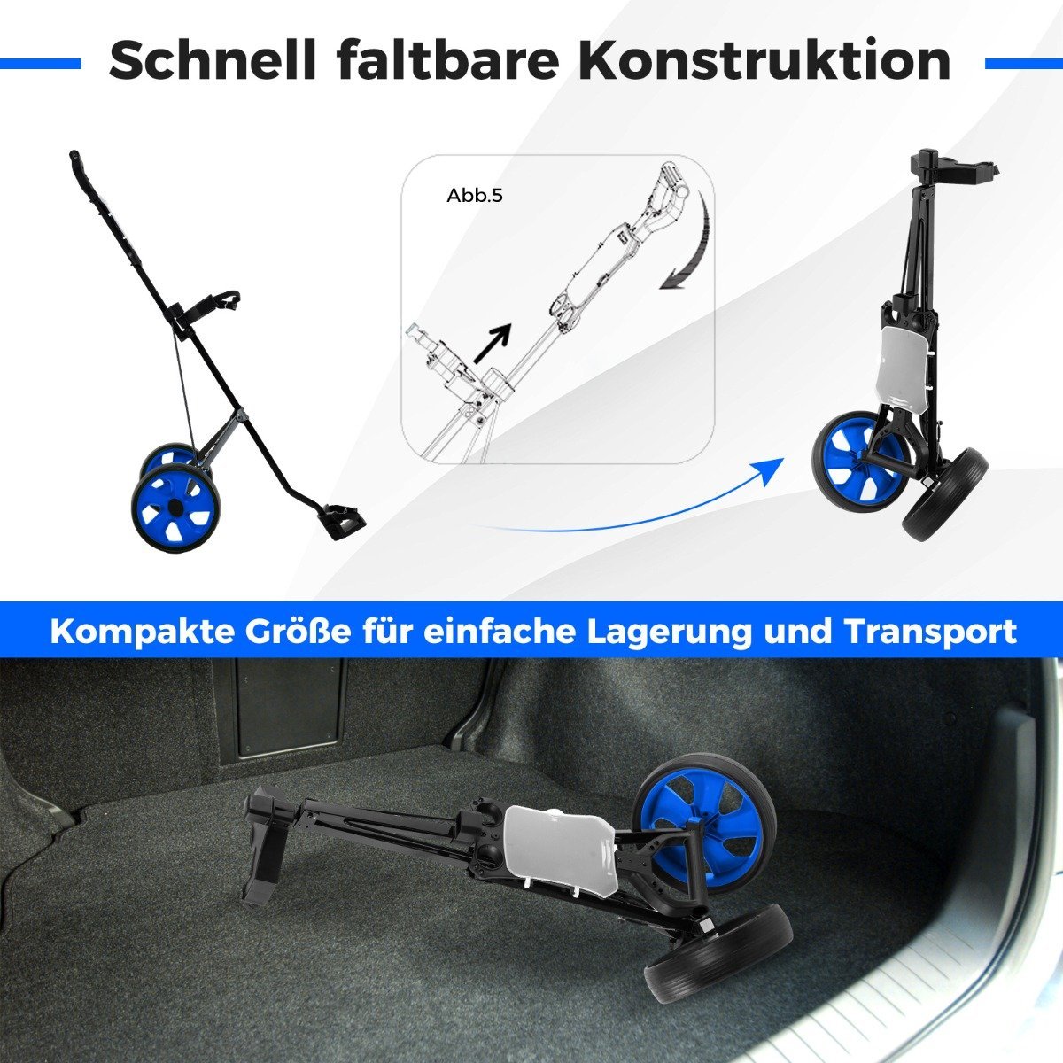 Sulankstomas dviejų ratų golfo vežimėlis su laikikliu (Mėlyna)