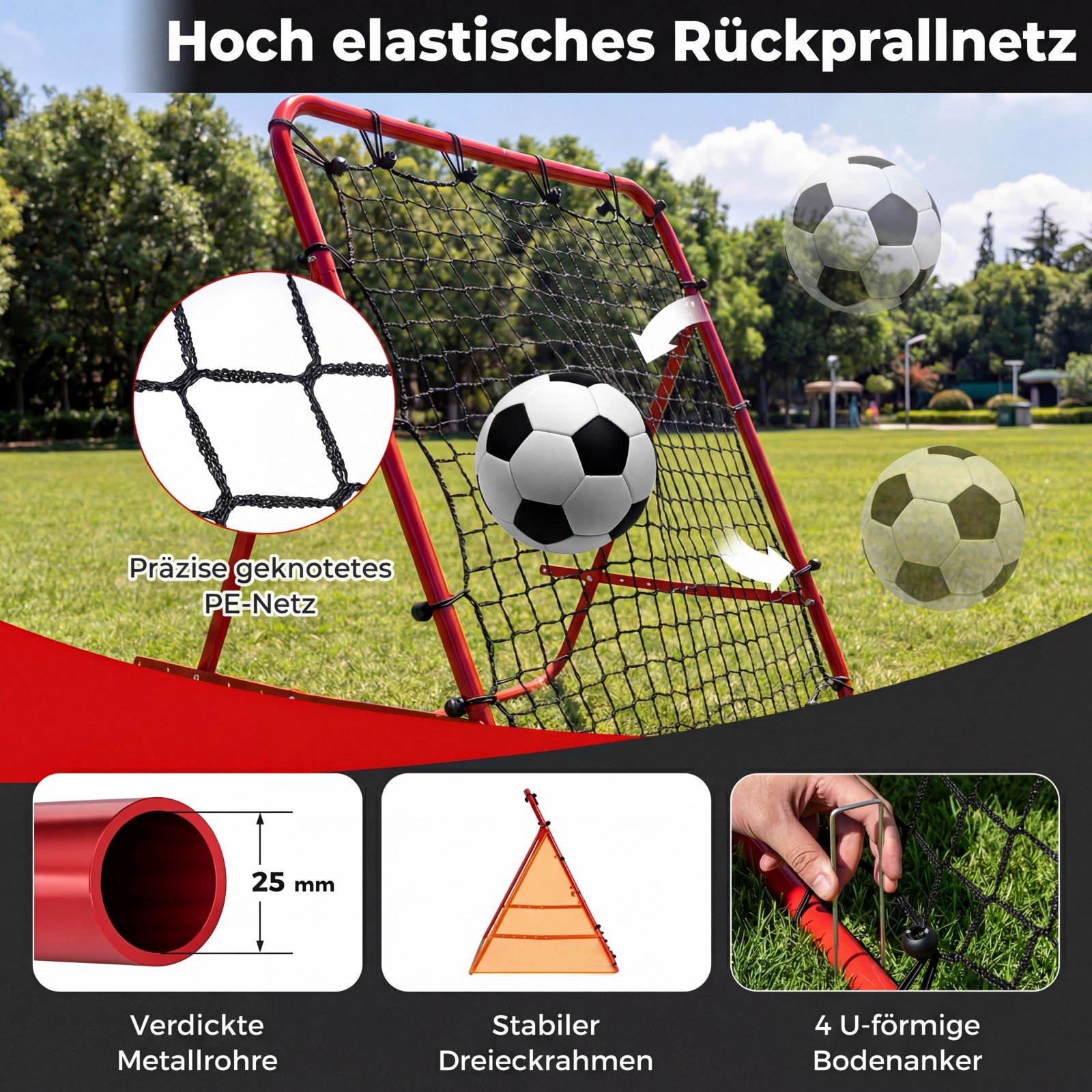 • Stabilus metalinis rėmas su trikampio formos konstrukcija ir 4 žemės inkarais garantuoja ilgaamžiškumą ir stabilumą net ir intensyvių treniruočių metu.