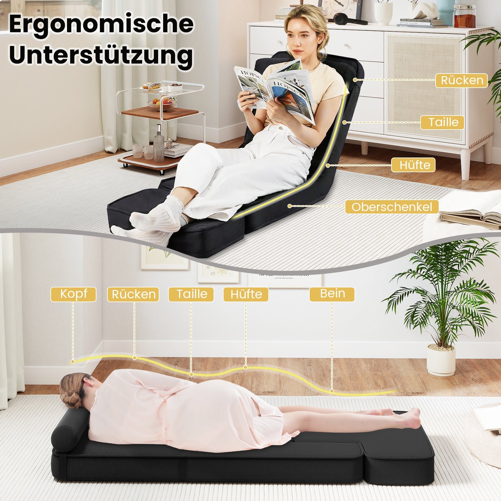 Atraskite nepriekaištingą komfortą ir universalumą su mūsų sulankstomu grindų foteliu. Šis elegantiškas fotelis, pasižymintis 5 padėčių reguliuojamu atlošu, puikiai tinka skaitymui, darbui, žaidimams ar tiesiog ramiam poilsiui. Jo reguliuojama kojų atrama lengvai virsta praktišku staliuku, o paminkštintas ritinėlis suteikia papildomą juosmens atramą.