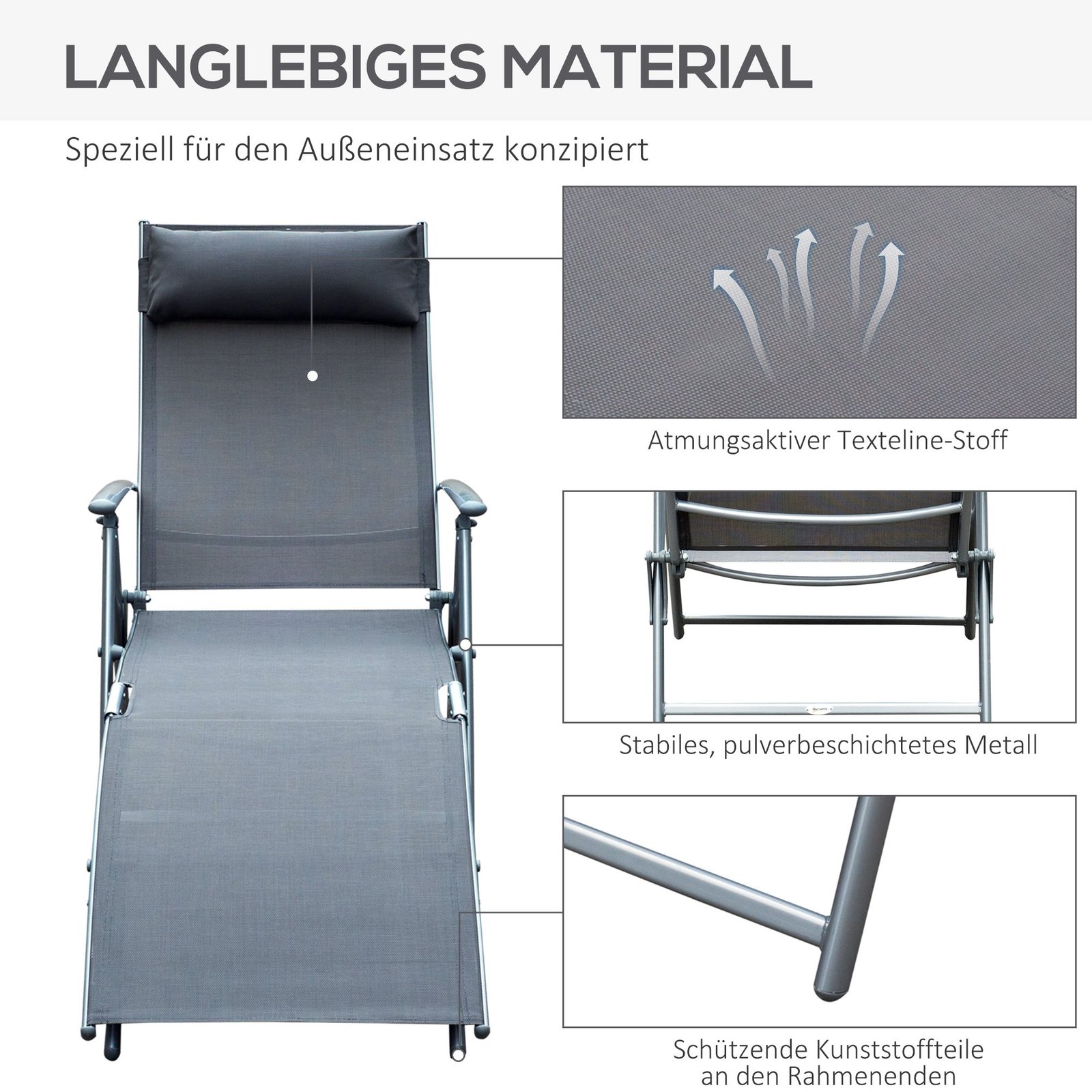 Atsipalaiduokite ant šio stabilaus, aukščiausios kokybės saulės gulto! Atlošo pasvirimo kampas reguliuojamas penkiomis pakopomis, todėl galite lanksčiai ilsėtis gulimoje ar sėdimoje padėtyje arba tarp jų. Papildomą komfortą užtikrina sėdynės užvalkalas iš orui pralaidžios tekstilinės medžiagos ir pridedama pagalvėlė. Kai nenaudojamas, saulės gultas kompaktiškai sulankstomas ir lengvai laikomas.