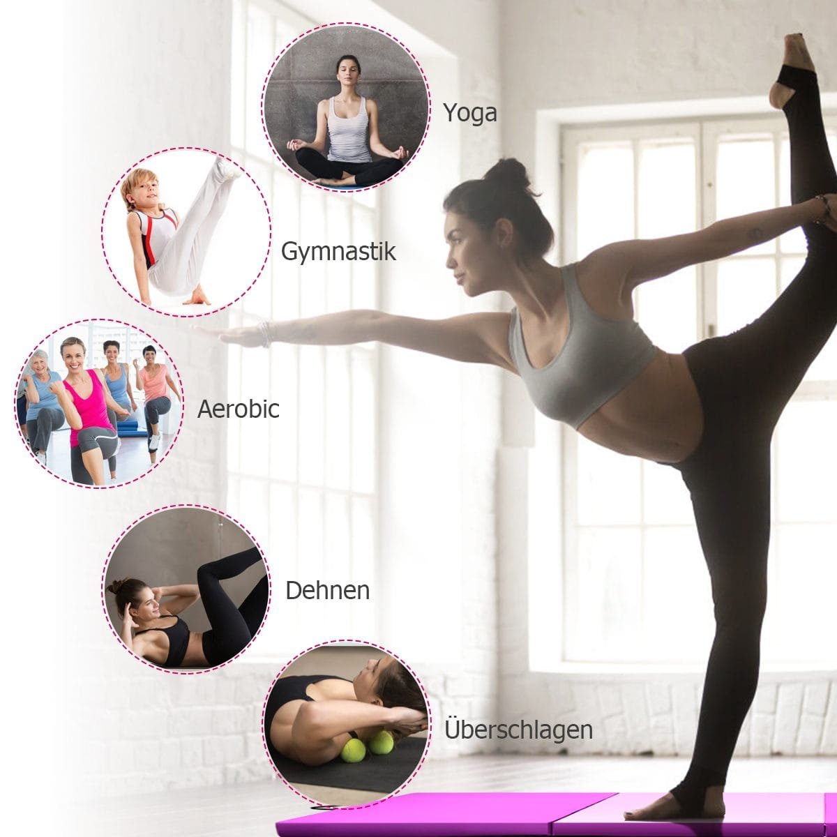 - Tinka įvairioms treniruotėms: jogai, gimnastikai, pilatesui, tempimo pratimams.