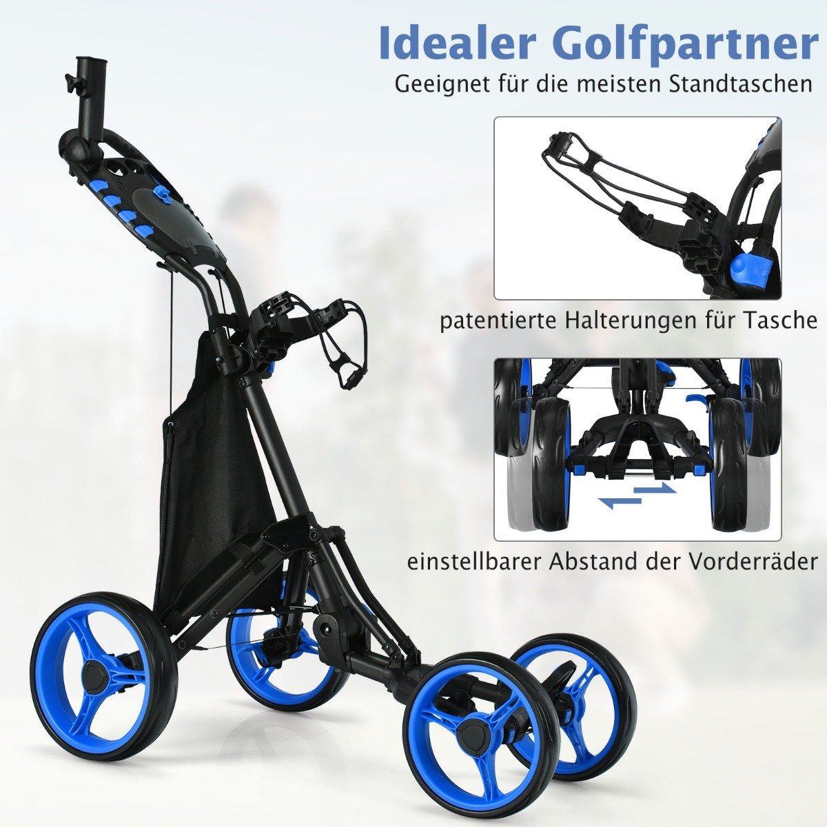 Sulankstomas keturratis golfo vežimėlis su reguliuojama rankena (Mėlyna)