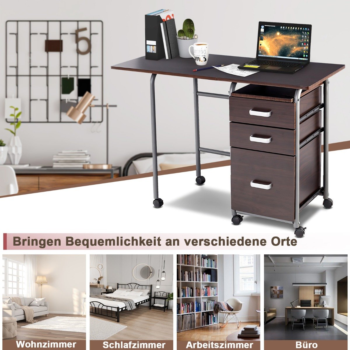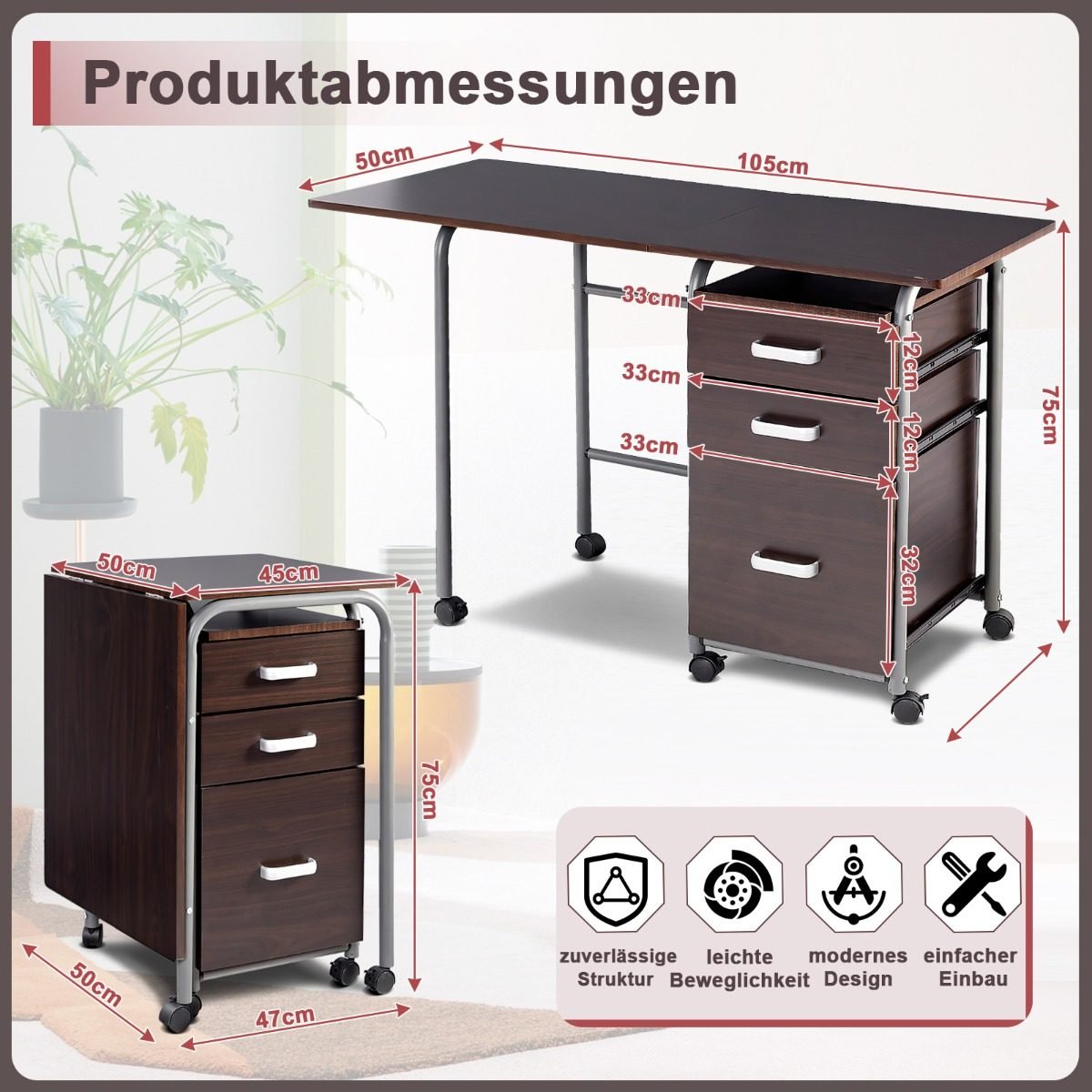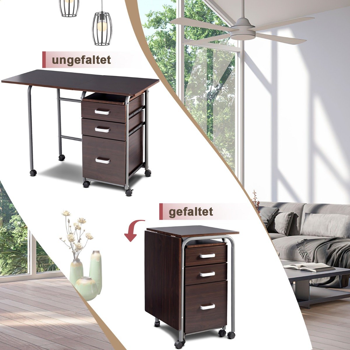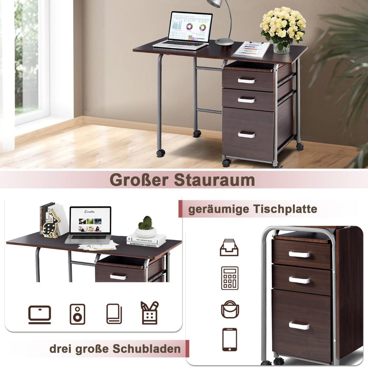 Sulankstomas kompiuterio stalas su ratukais ir stalčiais (Ruda)