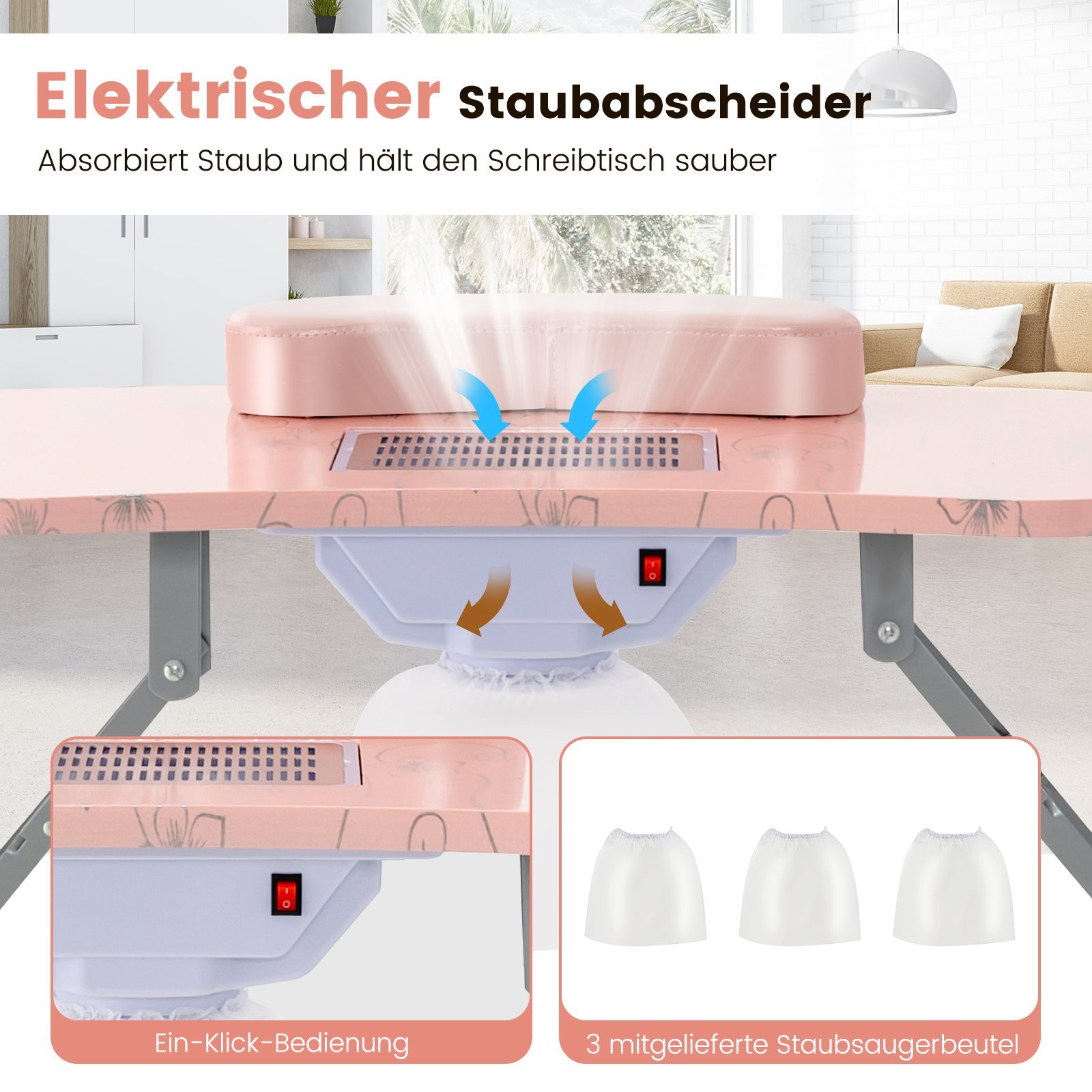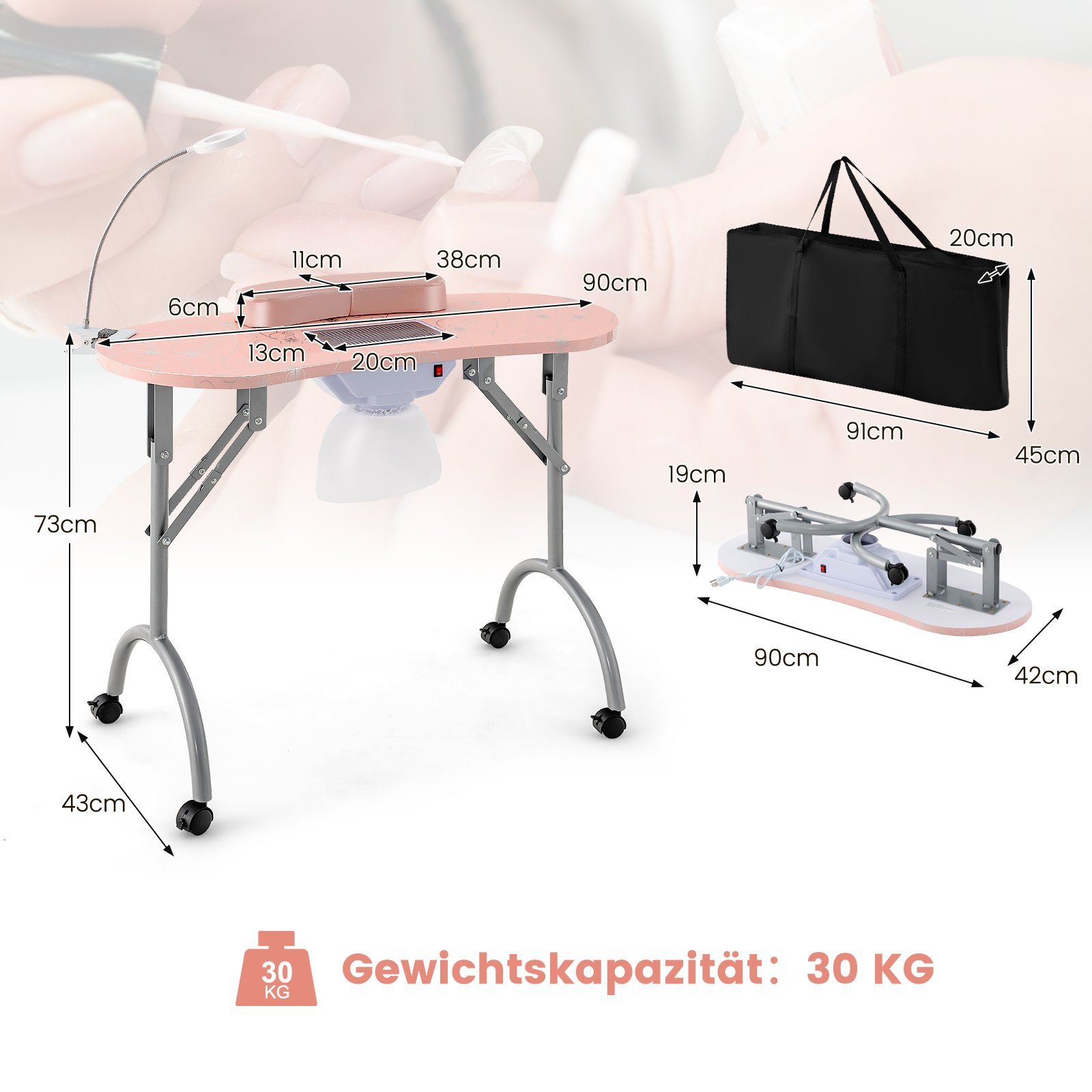 Sulankstomas manikiūro stalas su dulkių siurbliu ir LED lempos funkcija (Rožinė)
