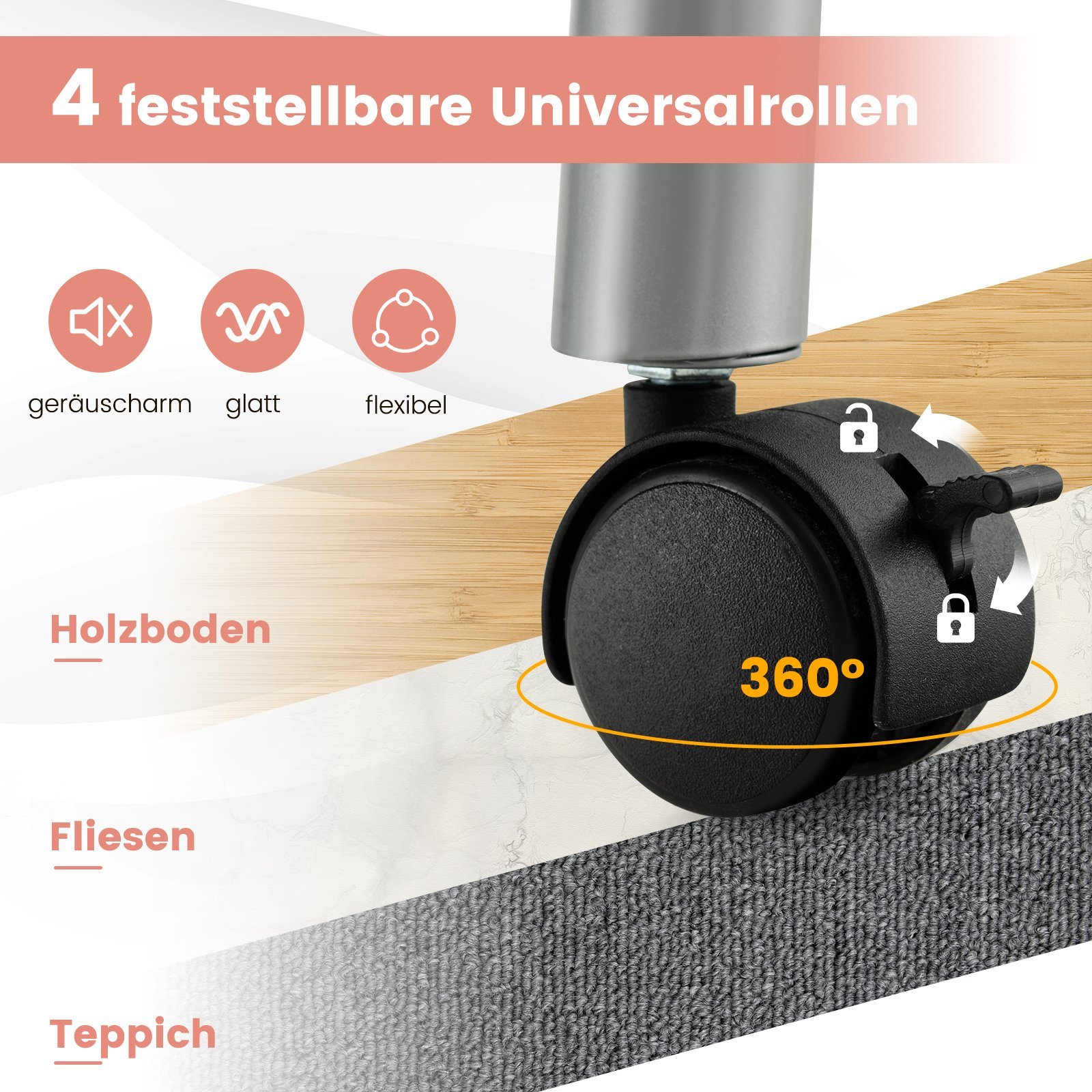 - Keturi ratukai su fiksavimo mechanizmu užtikrina stabilumą ir lengvą manevravimą.