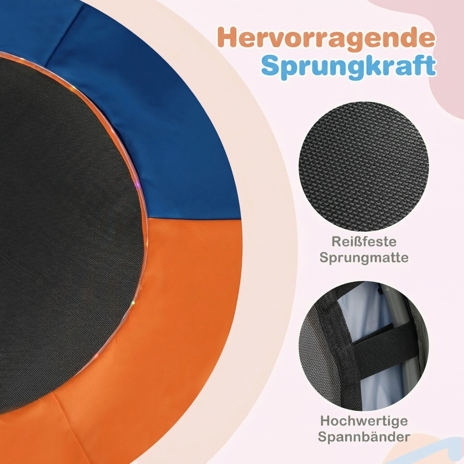 - Inovatyvi, spyruoklių neturinti konstrukcija su 20 patvarių įtempiamųjų juostų užtikrina saugesnį, sklandesnį ir tylesnį šokinėjimą, mažinant pirštų įstrigimo riziką.