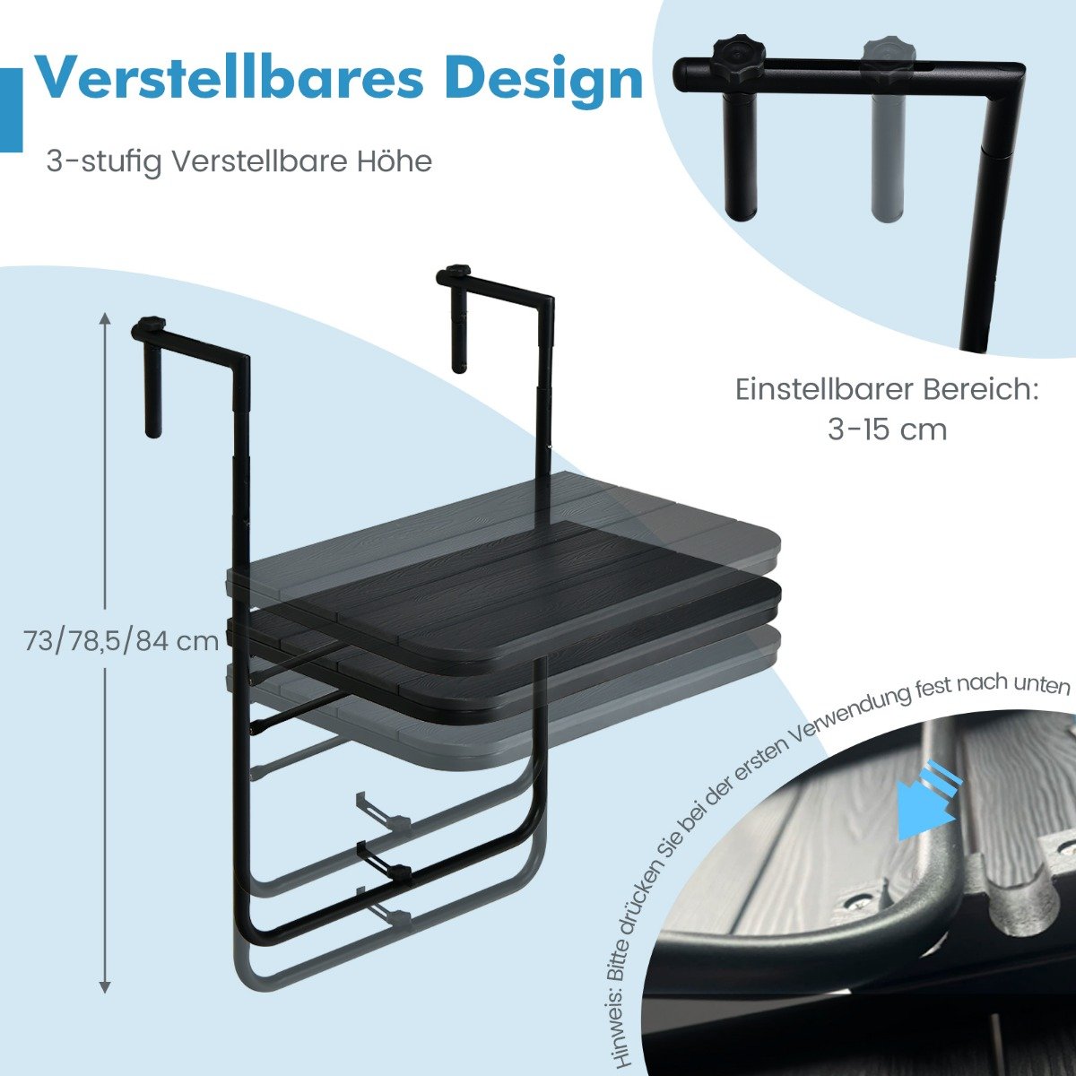 Sukurkite tobulą erdvę su mūsų pakabinamu balkono stalu – idealiai tinkančiu naudoti tiek lauke, tiek viduje! Šis stalas lengvai ir be įrankių prisitaiko prie įvairaus storio turėklų bei siūlo reguliuojamą aukštį, kad atitiktų visus jūsų poreikius.