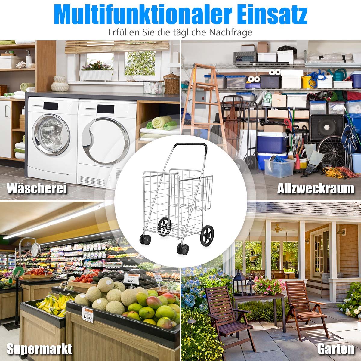 Pamirškite nepatogius ir sunkiai nešamus pirkinių maišus! Šis lengvas ir patvarus sulankstomas pirkinių vežimėlis taps Jūsų nepakeičiamu pagalbininku kasdienybėje. Dėl didelių ratų ir apgalvoto dizaino jis puikiai tiks ne tik apsipirkinėjant, bet ir vežant skalbinius ar kitus daiktus.