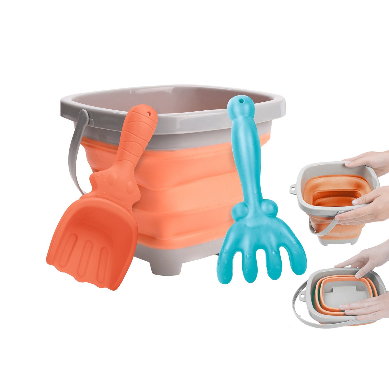 Sulankstomas silikoninis kibirėlis su grėbliuku ir kastuvėliu, oranžinis
