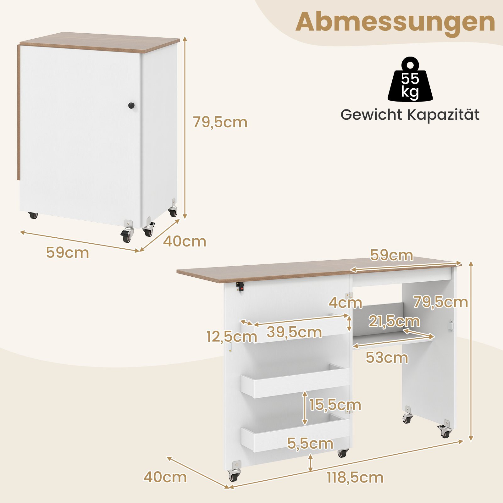 • Išmatavimai (išskleistas): 118,5 x 40 x 79,5 cm (I x P x A)