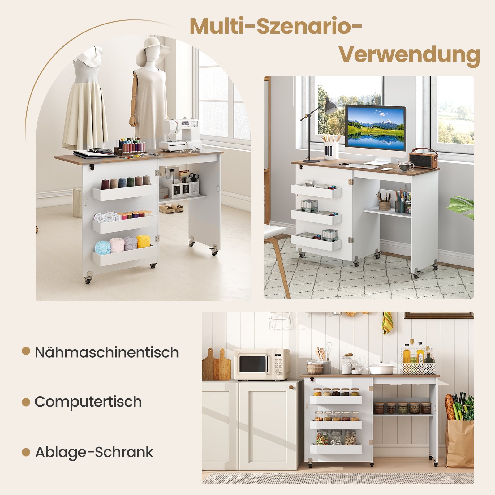 Sulankstomas siuvimo stalas su ratukais ir integruotomis daiktadėžėmis (Balta)
