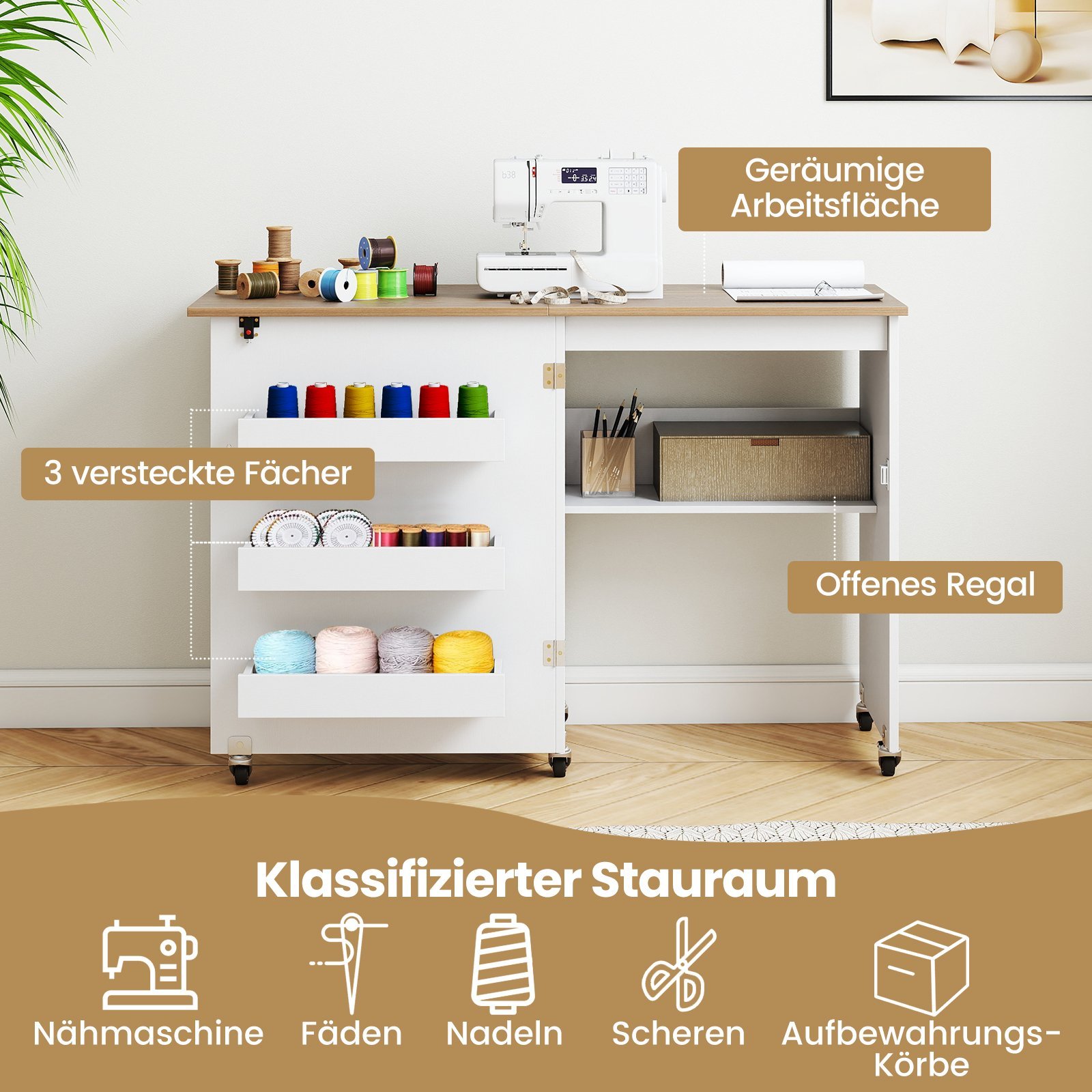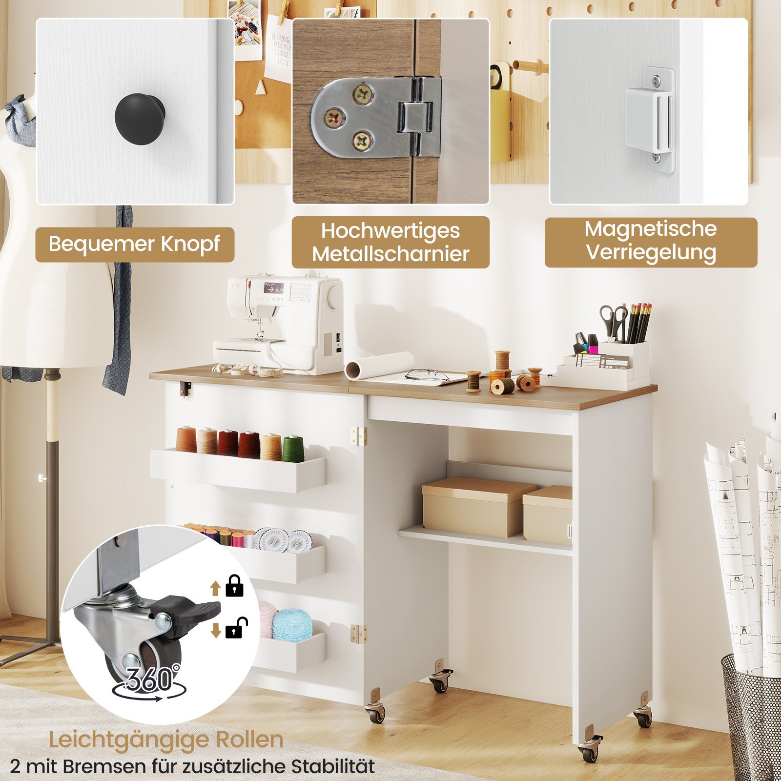 • Organizuotas daiktų laikymas: Trys paslėptos daiktadėžės ir atvira lentyna užtikrina tvarkingą siuvimo reikmenų, siūlų ir kitų smulkmenų laikymą.