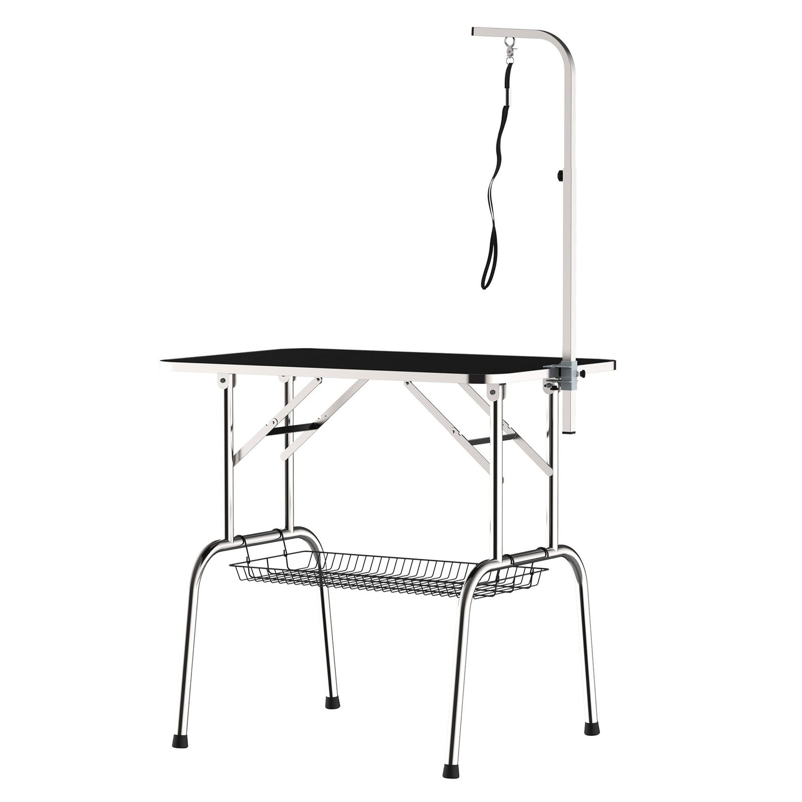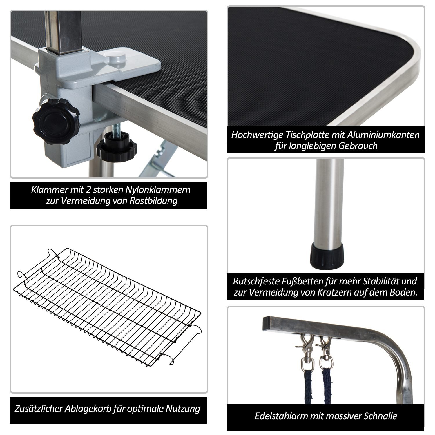 Šis šunų kirpimo stalas paliks puikų įspūdį. Patogiai prižiūrėsite šunį ir kitus augintinius. Jis tinka tiek privatiems naudotojams, tiek profesionaliems šunų salonams. Ant jo yra tvirta pagrindo plokštė. Ji padengta įbrėžimams ir slydimui atspariu gumos sluoksniu, kad net ir nervingesni keturkojai būtų saugiai prižiūrimi. Lankstus laikiklis turi tvirtinimo diržą, sukasi 360° kampu ir jo aukštį galima reguliuoti rankiniu būdu.