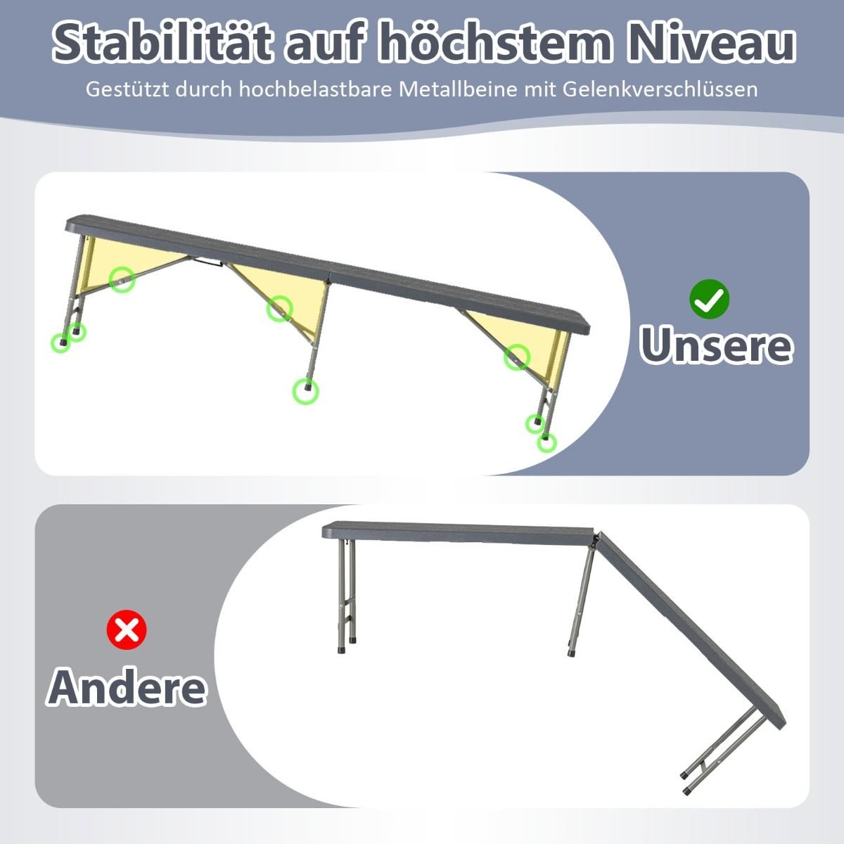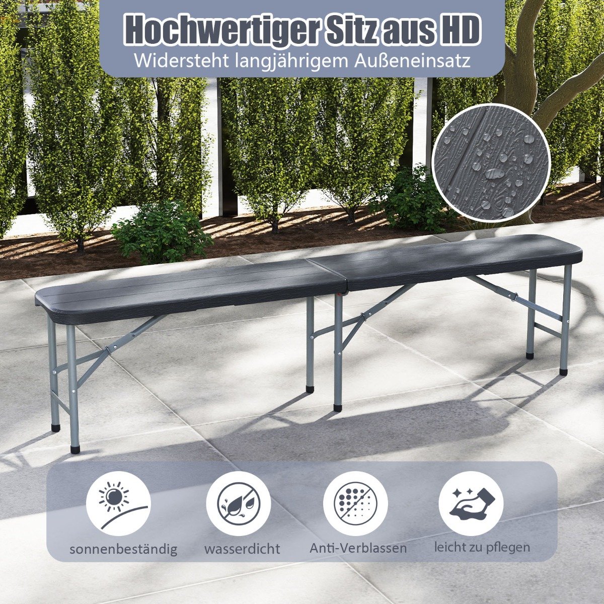 Patirkite maksimalų komfortą su šiuo 180 cm ilgio sulankstomu suoliuku, idealiai tinkančiu bet kokiam lauko renginiui. Jo sėdimoji dalis pagaminta iš aukštos kokybės HDPE, atspari saulės spinduliams, vandeniui ir blukimui, užtikrinanti ilgalaikį naudojimą lauke. Tvirtos metalinės kojelės ir saugus užfiksavimo mechanizmas leidžia suoliukui išlaikyti iki 600 kg svorį. Sulankstomas dizainas palengvina laikymą ir transportavimą.