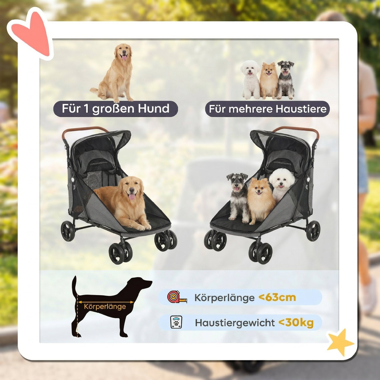 Palepinkite savo augintinį šiuo vežimėliu šunims. Didelė kabina (88x52x55 cm) suteikia patogią vietą pagyvenusiems ar dideliems šunims iki 30 kg. Stabilumą užtikrina tvirtas rėmas ir visų ratų amortizacija. 600D Oksfordo audinys, dvigubi pavadėliai ir šviesą atspindinčios juostelės užtikrina saugumą. Viena ranka sulankstoma funkcija leidžia lengvai jį laikyti. Idealiai tinka apsilankymams pas veterinarą ar pasivaikščiojimams – gryna gyvenimo kokybė Jūsų šuniui.