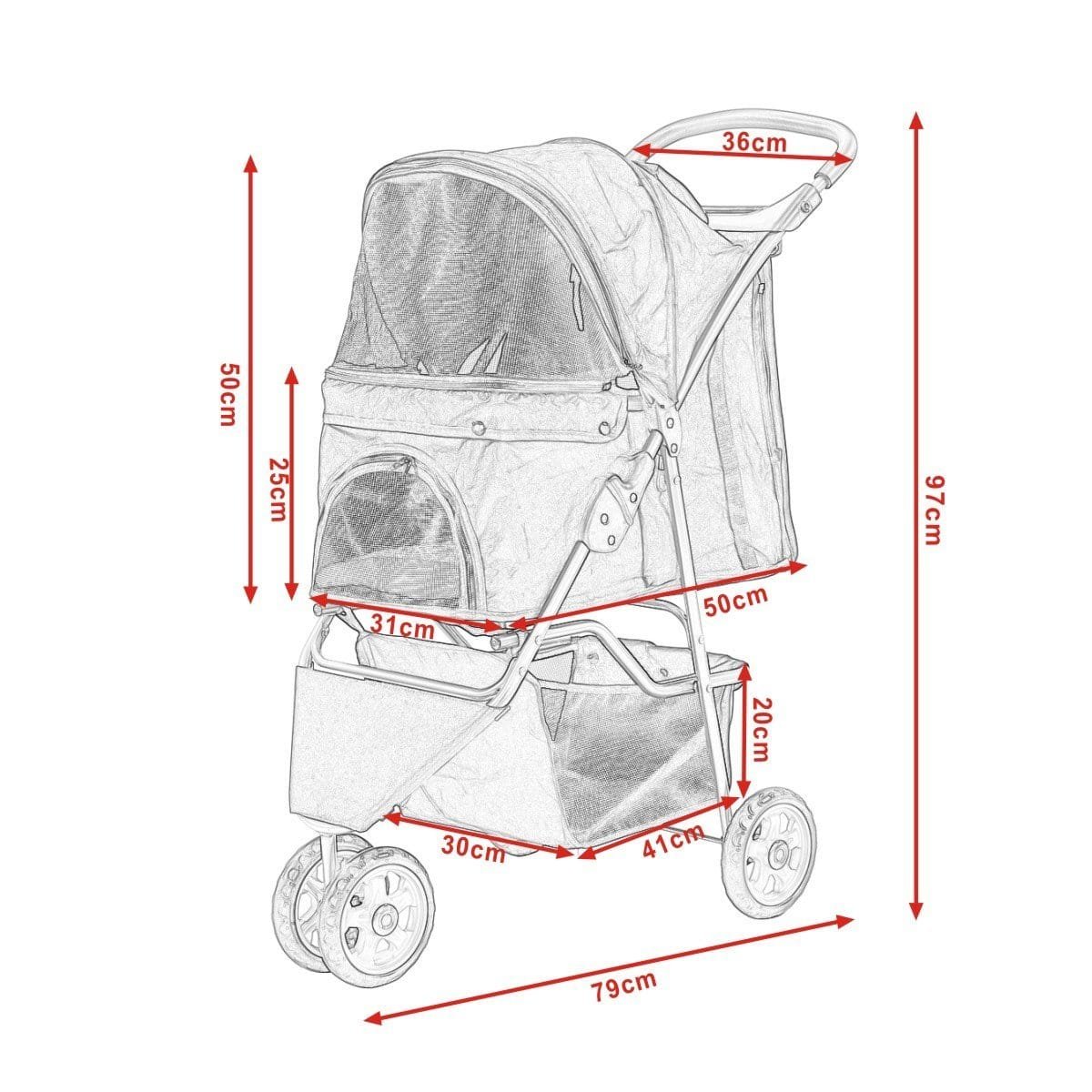 Mūsų vežimėlis gyvūnams – tai patogi transporto priemonė Jūsų šunims, katėms ar kitiems smulkiems augintiniams. Jame augintinis gali patogiai pailsėti, o stogelis apsaugo nuo vėjo, lietaus ir tiesioginių saulės spindulių. Patvarus polipropileno tinklelis užtikrina optimalią ventiliaciją, gerą matomumą, apsaugą nuo vabzdžių ir saugų augintinio uždarymą.