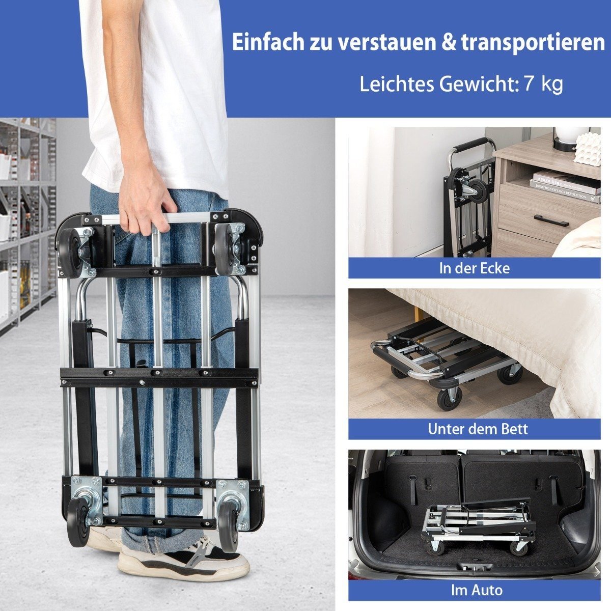 Atsikratykite vargo kilnodami sunkius daiktus! Šis funkcionalus, sulankstomas vežimėlis sukurtas palengvinti jūsų kasdienius darbus. Lengvas, bet tvirtas aliuminio rėmas ir ištraukiama platforma užtikrina stabilumą, leidžiantį saugiai perkelti daiktus.