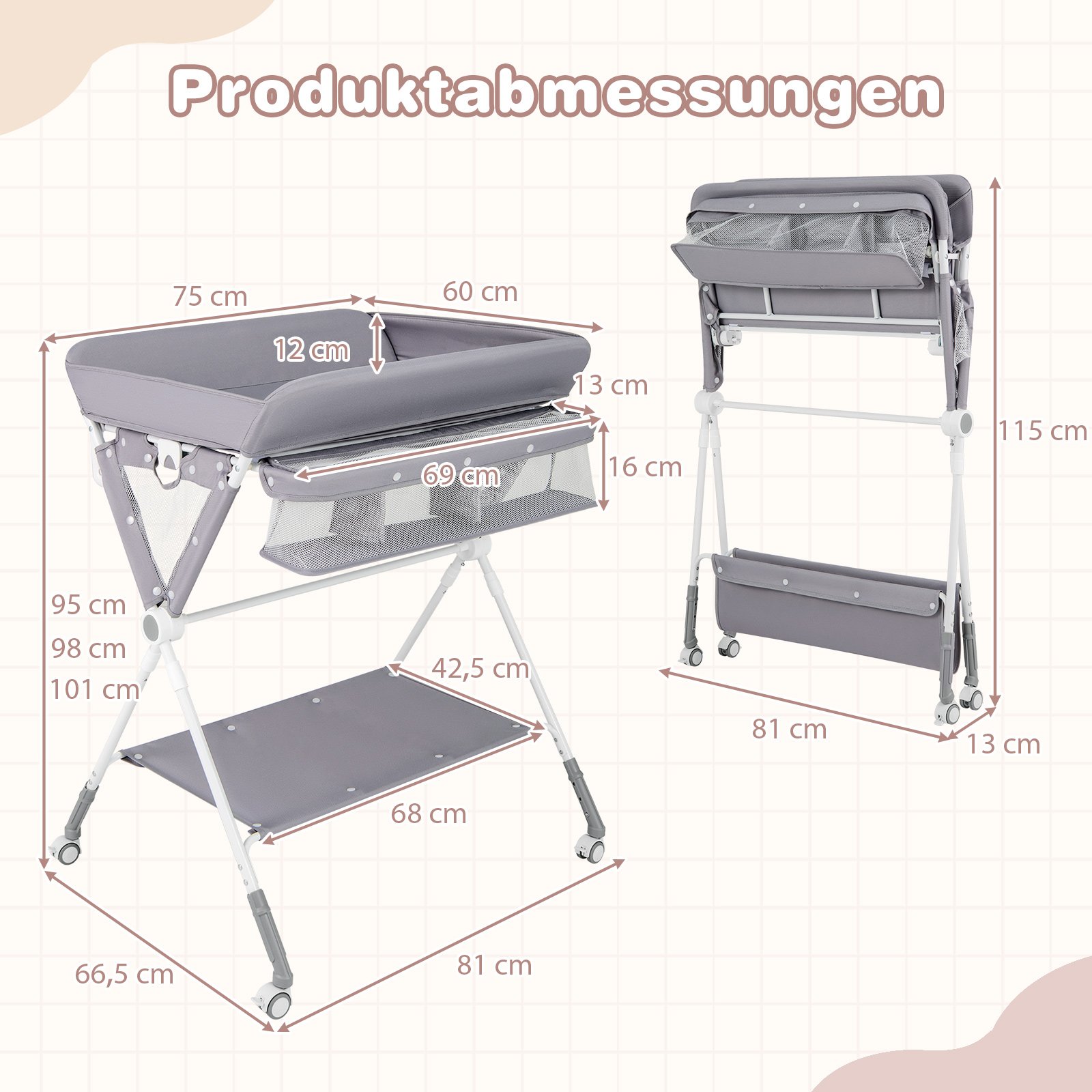 Sulankstomas vystymo stalas su 3 reguliuojamais aukščiais ir fiksuojamais ratukais (Pilka)