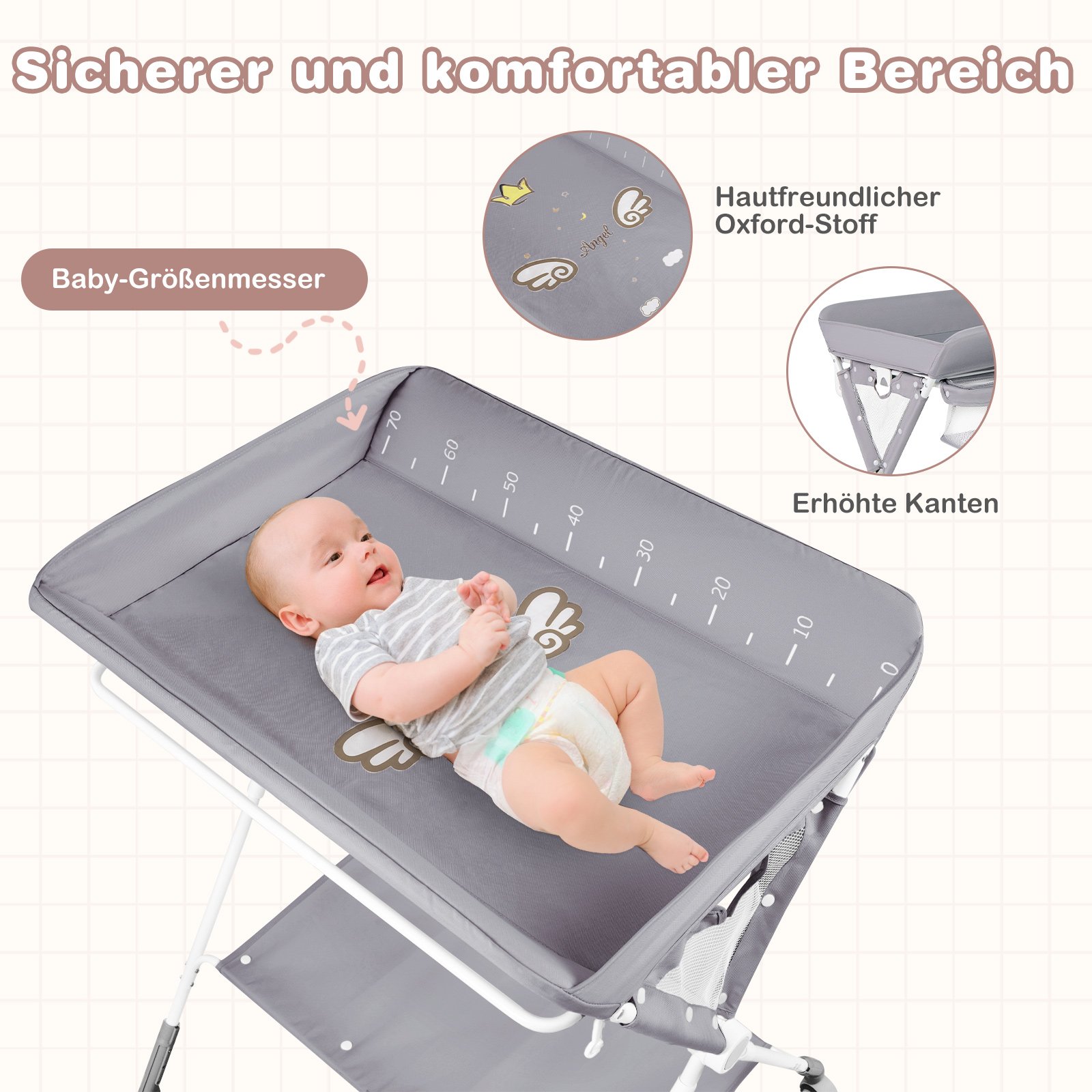 - Didelis daiktų laikymo krepšys ir apatinė lentyna suteikia daug vietos kūdikių reikmenims.