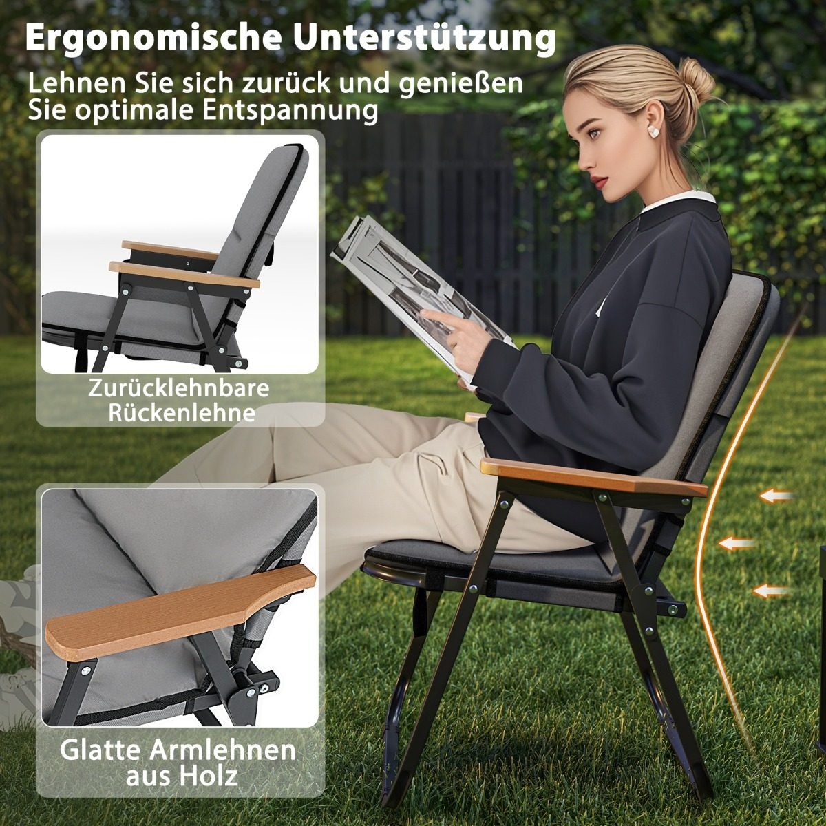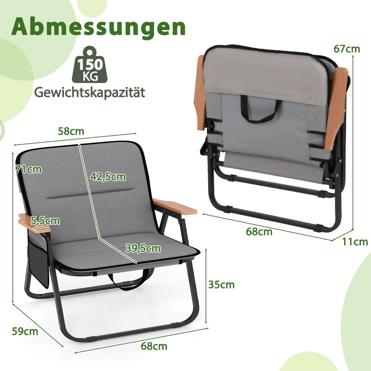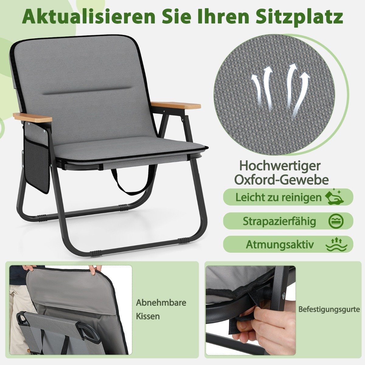Sulankstomos kempingo kėdės su nuimama pagalve ir šonine kišene (Pilka)