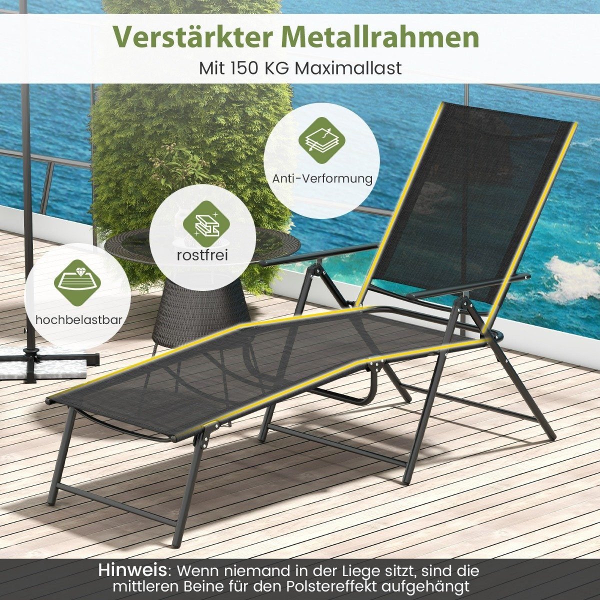 - Tvirtas metalinis rėmas garantuoja maksimalų stabilumą ir ilgaamžiškumą (keliamoji galia iki 150 kg)
