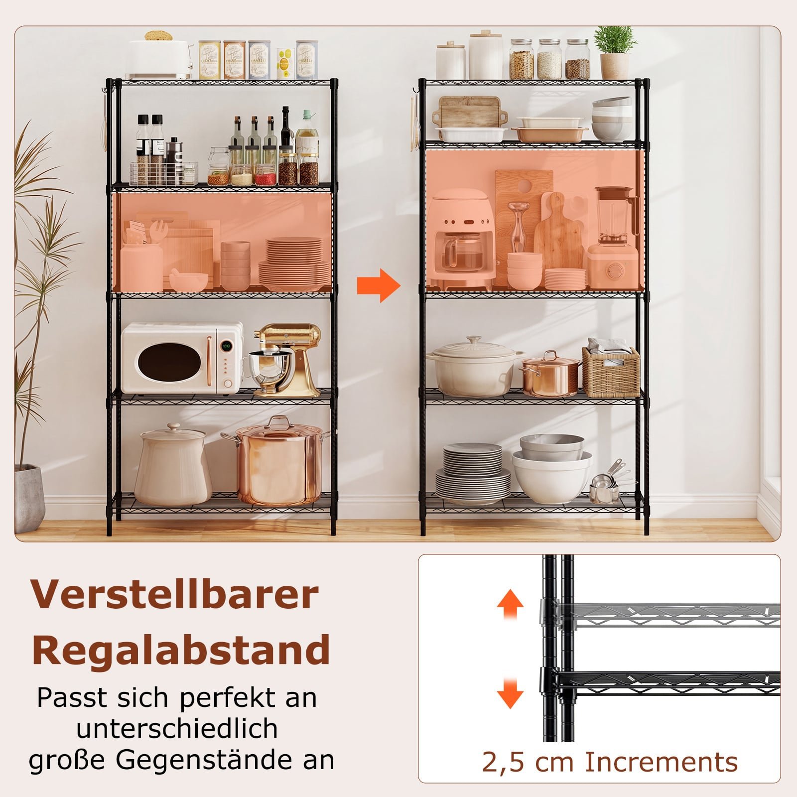 - Universalios reguliuojamos lentynos: 5 lentynos su 2,5 cm žingsniais ir 4 papildomi kabliukai leidžia pritaikyti stelažą individualiems poreikiams.