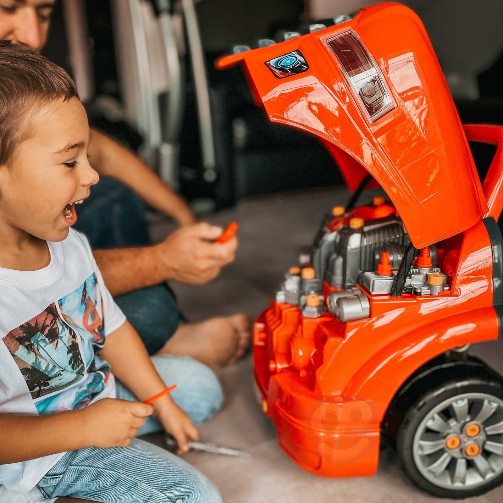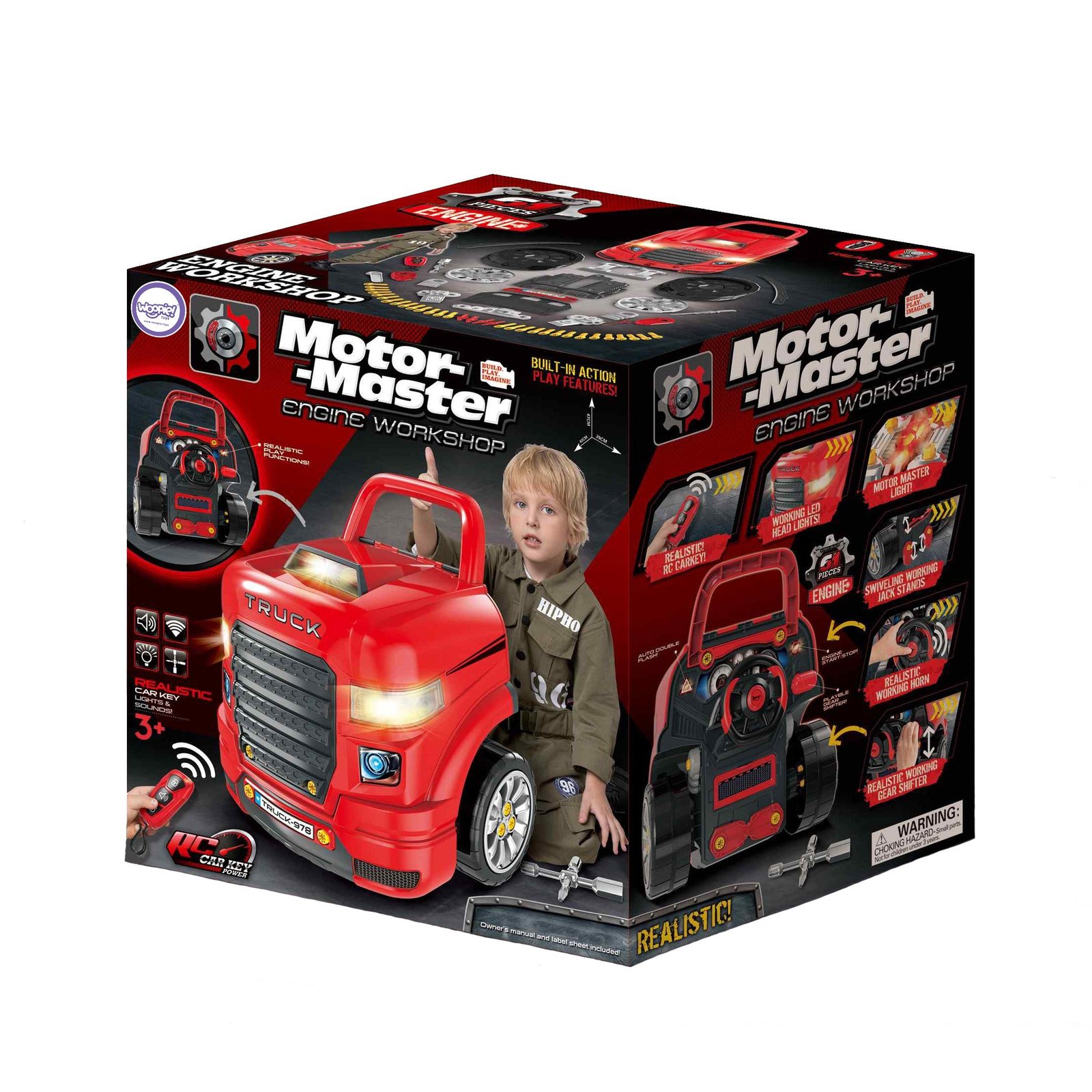 WOOPIE sunkvežimio priekio imitacija su pakeliamu variklio gaubtu, vairu ir prietaisų skydeliu – puiki dovana jaunajam mechanikui. Po vairu esančioje daiktadėžėje vaikas ras įrankių, rankenėlių ir varžtų. Mažasis meistras galės atlikti įvairius transporto priemonės remontus ir apžiūras: tikrinti ratus, sparnus, variklį, keisti uždegimo žvakes ar radiatoriaus groteles.