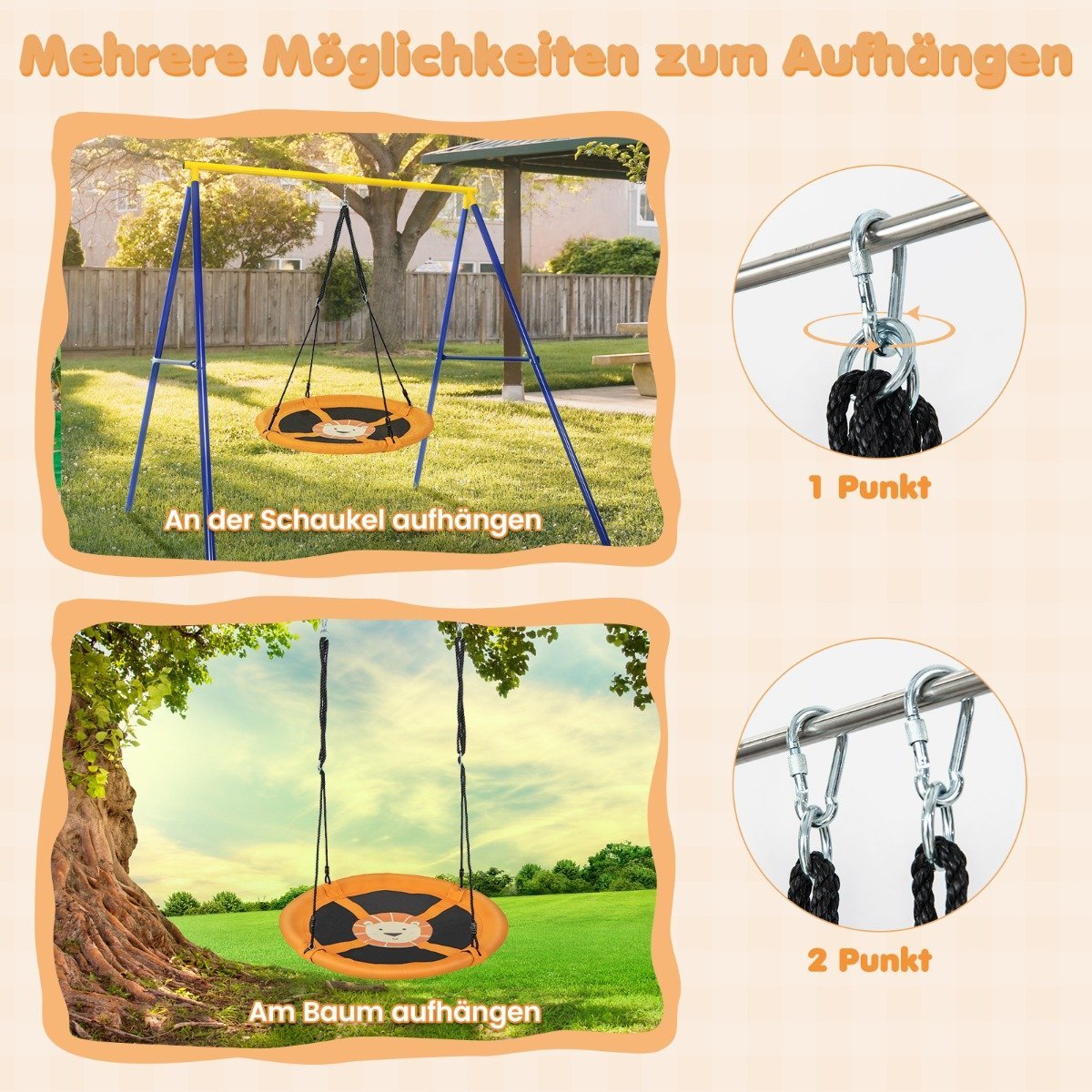 - Dvi tvirtinimo galimybės: vienu arba dviem taškais, skirtingiems supimosi pojūčiams.