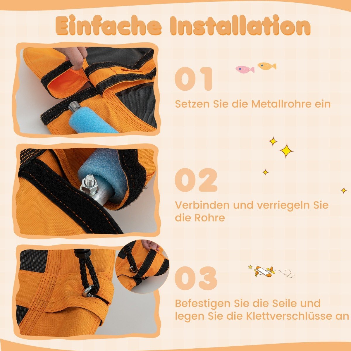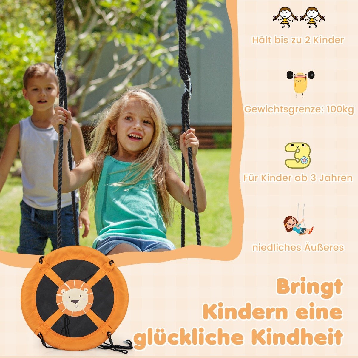 - Reguliuojamo ilgio virvės (118–173 cm) leidžia lengvai pritaikyti sūpynes pagal poreikį.