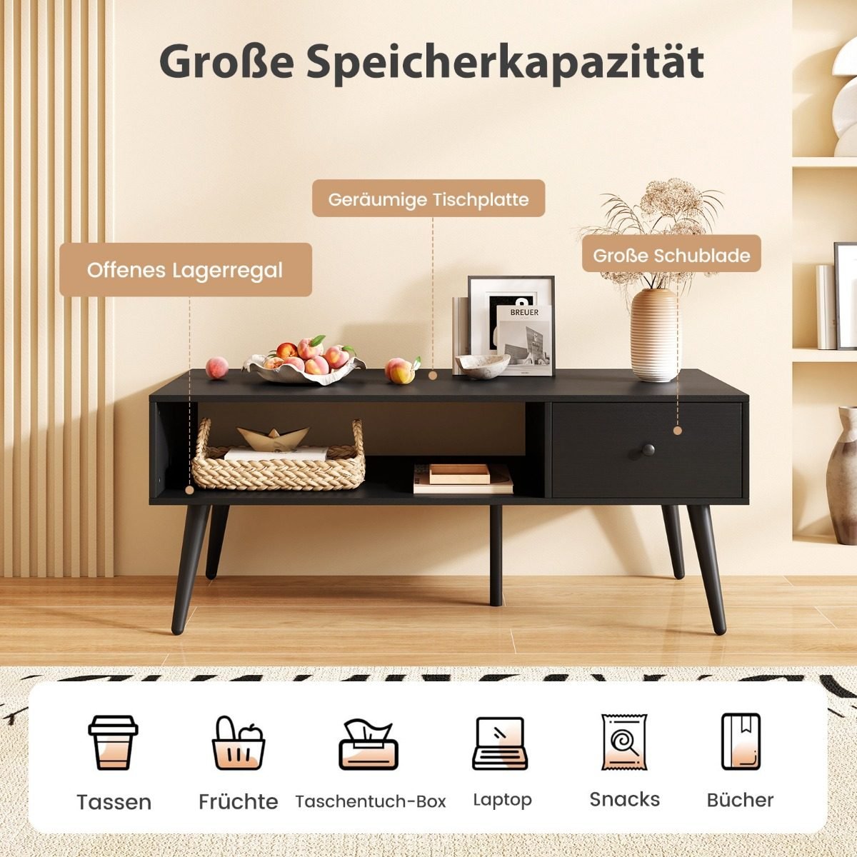 Svetainės staliukas su stalčiumi ir atvira lentyna (Juoda)