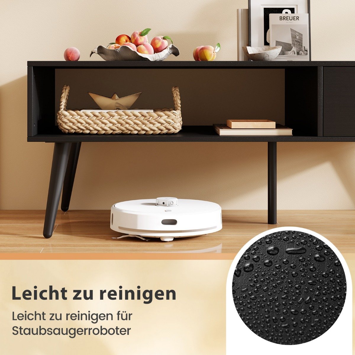 • Erdvus stalviršis, papildomas stalčius ir atvira lentynėlė suteikia patogią vietą daiktams laikyti.