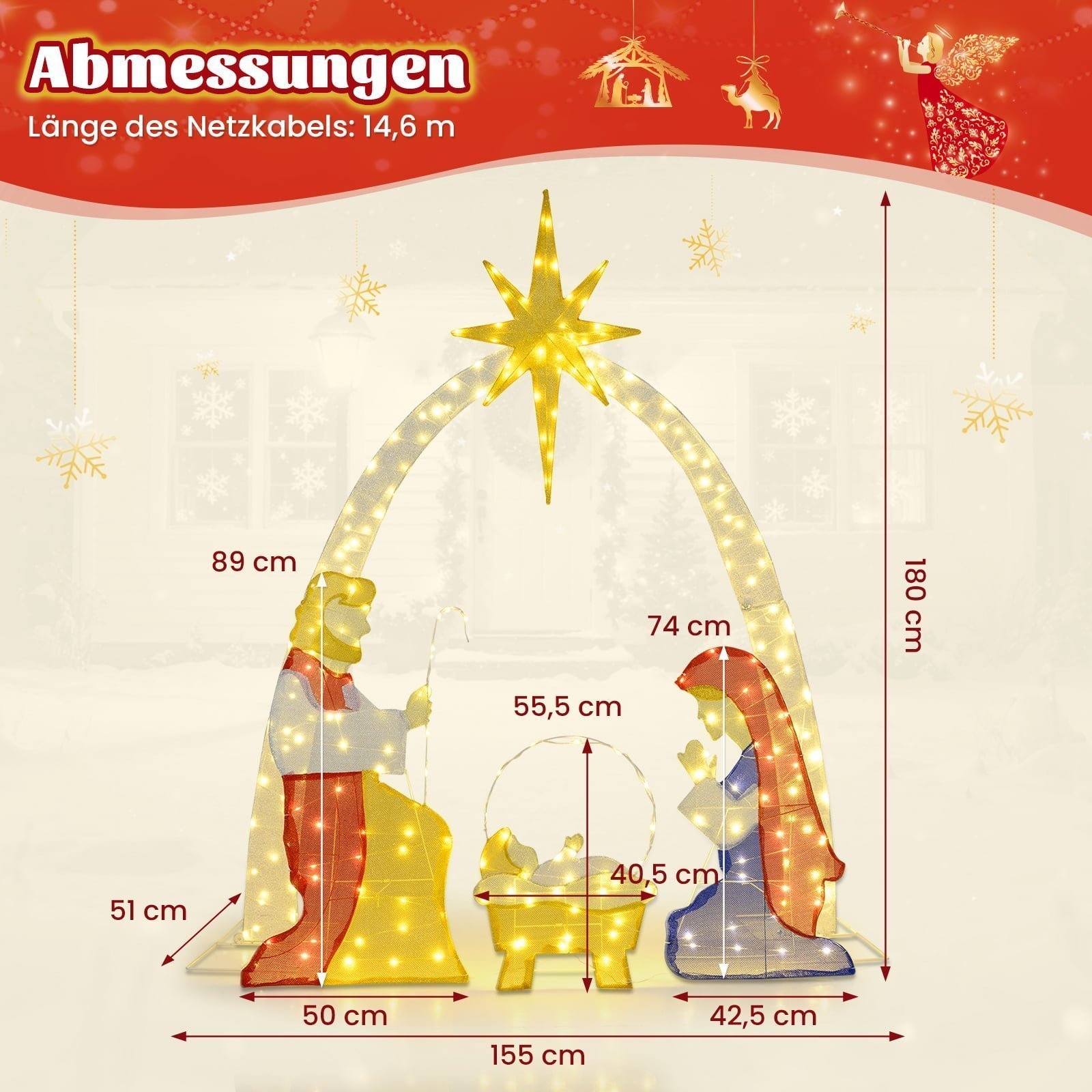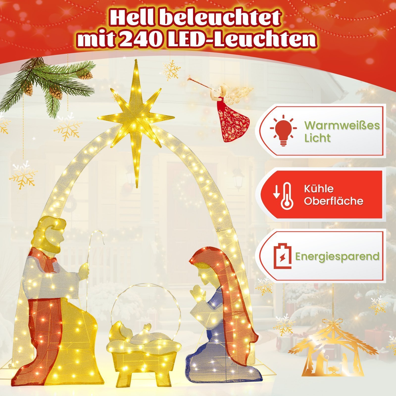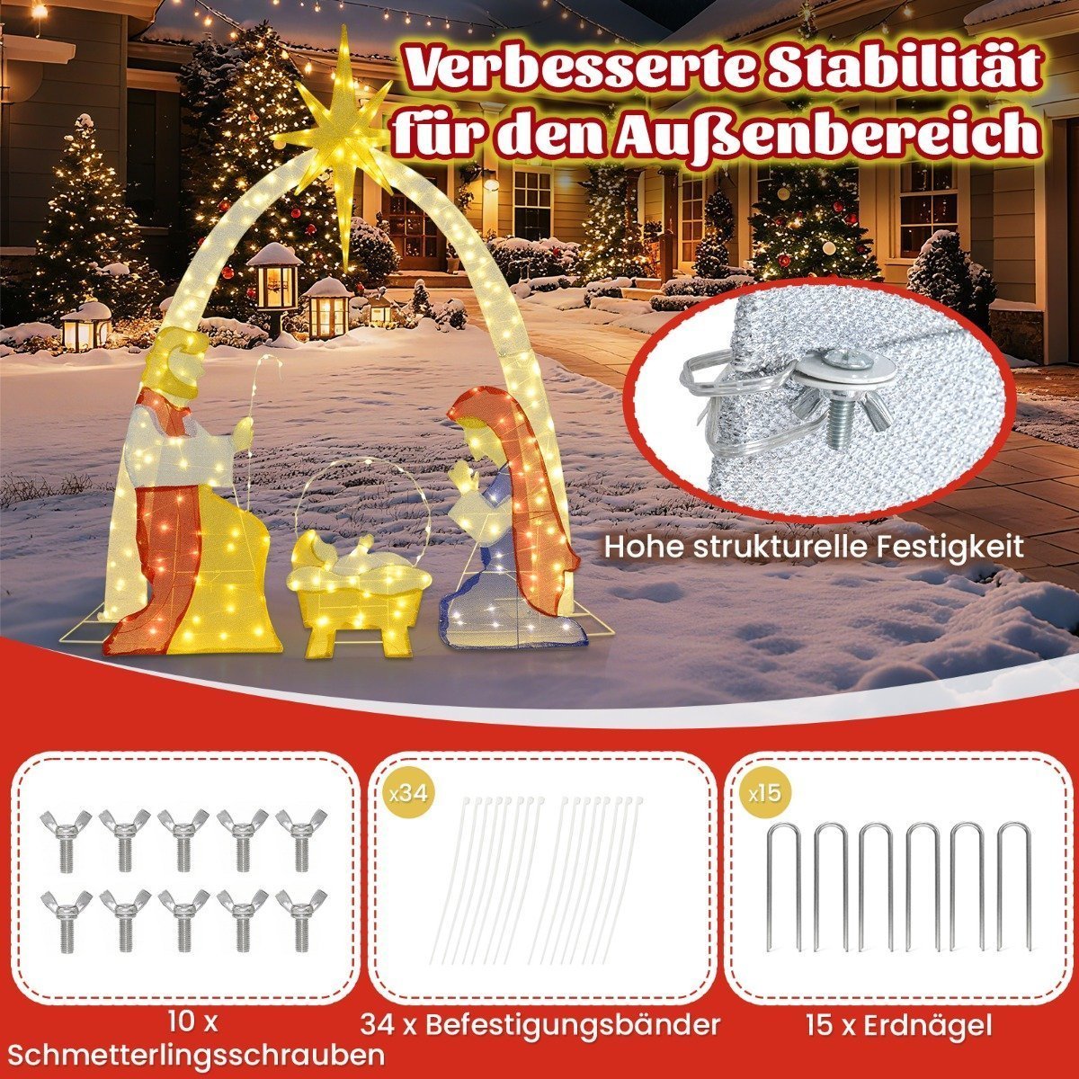Suteikite šviesos savo šventėms su elegantiška apšviesta Kalėdų prakartėle, vaizduojančia Mariją, Juozapą ir kūdikėlį Jėzų po spindinčia žvaigžde. Ši lauko dekoracija sukurs jaukią šventinę atmosferą ir puikiai papildys jūsų Kalėdų dekoracijas. Pagaminta iš vandeniui atsparaus audinio ir tvirtinama patikimais elementais, ji užtikrins ilgalaikį stabilumą ir atsparumą įvairioms oro sąlygoms. Lengvai montuojama, o atskiriamos figūros leis jums lanksčiai kurti šventinę sceną.