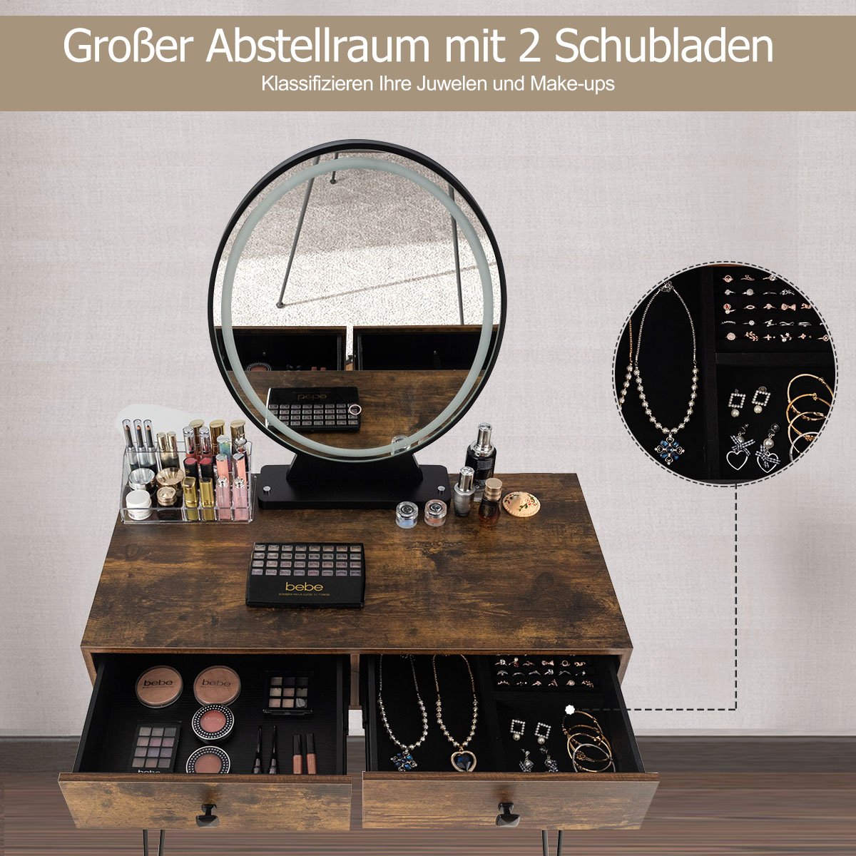 Šviesos veidrodžio ir minkšto pufiko šukuosenų staliukas (Senas atspalvis)