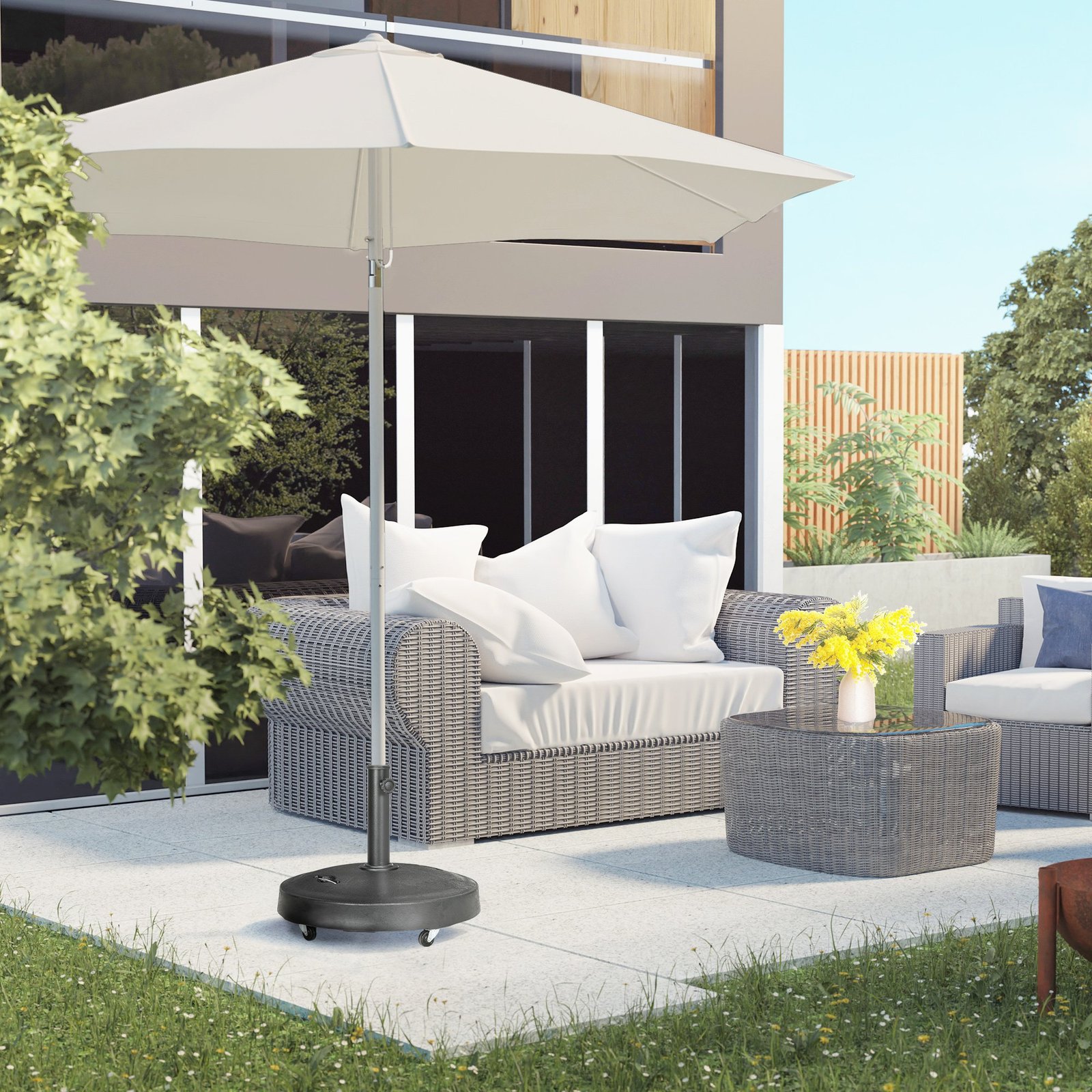 Mėgaukitės lauko gyvenimo būdu su patraukliu skėčio nuo saulės stovu. Jame yra ratai ir rankenos, kad būtų lengva ridenti ir nešti. Tiesiog derinkite savo skėtį nuo saulės su stalu ir kėdėmis, kad sukurtumėte atsipalaidavimo oazę. Mūsų pasunkintas skėčio stovas saugiai ir stabiliai laiko jūsų skėtį vietoje, kad jis galėtų suteikti jums taip reikalingą pavėsį. Su šiuo lauko skėčio stovu mėgausitės dienomis po skėčiu.