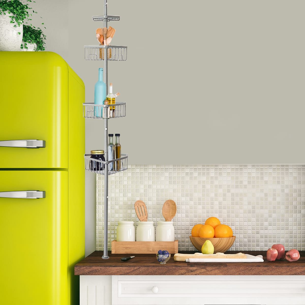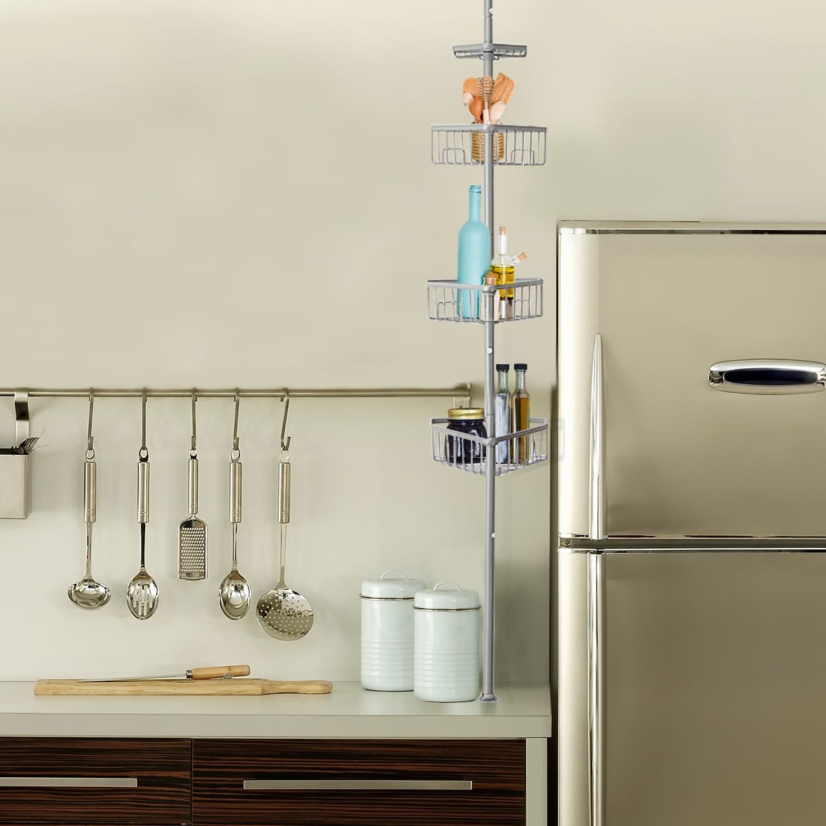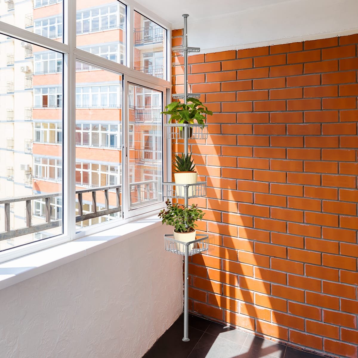 Teleskopinis kampinis vonios lentynų stovas su 4 reguliuojamomis lentynomis (Sidabrinė)