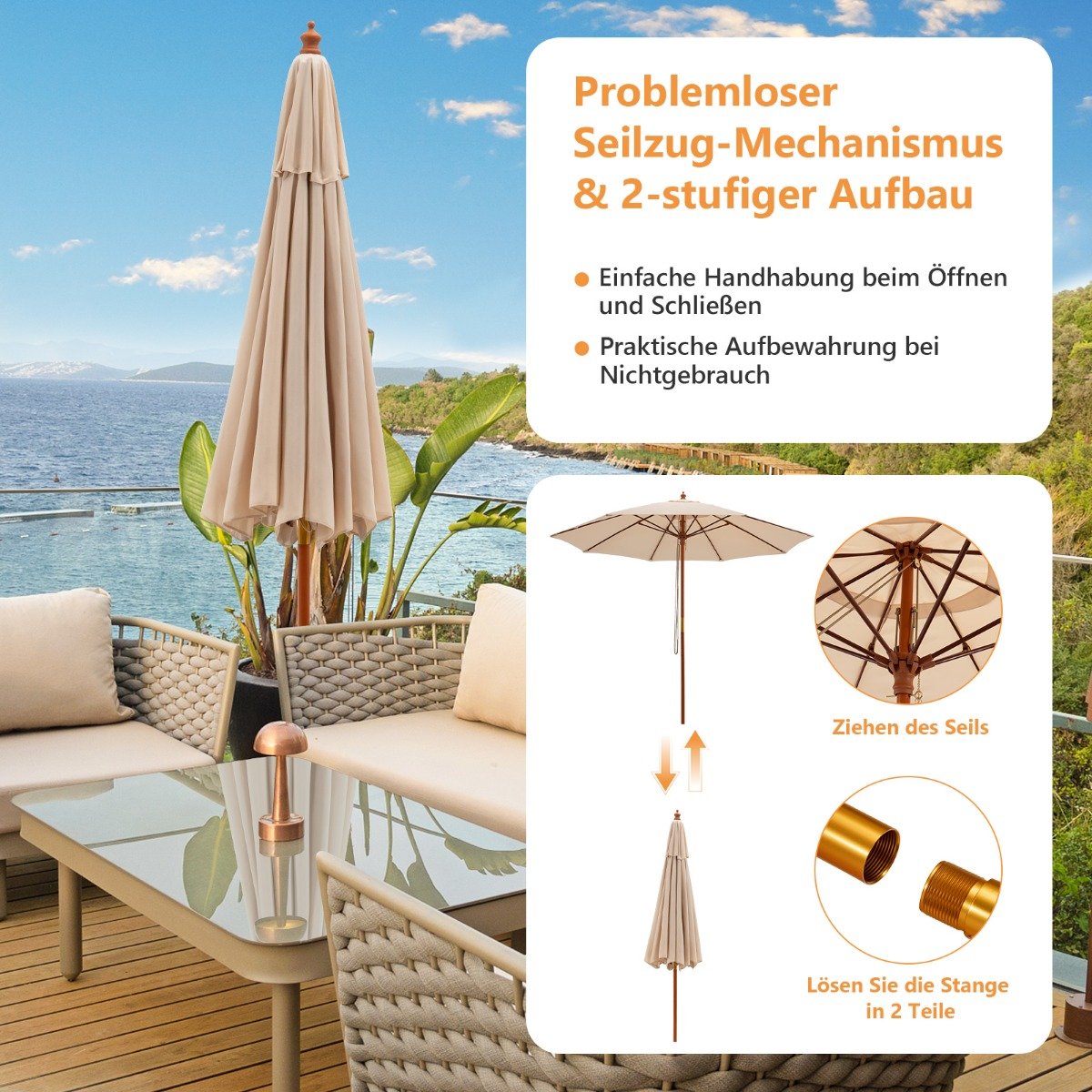 - Lengvai naudojamas virvės traukimo mechanizmas leidžia greitai atidaryti ir uždaryti skėtį.
