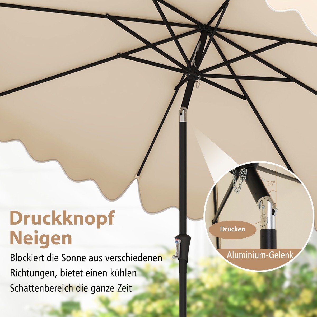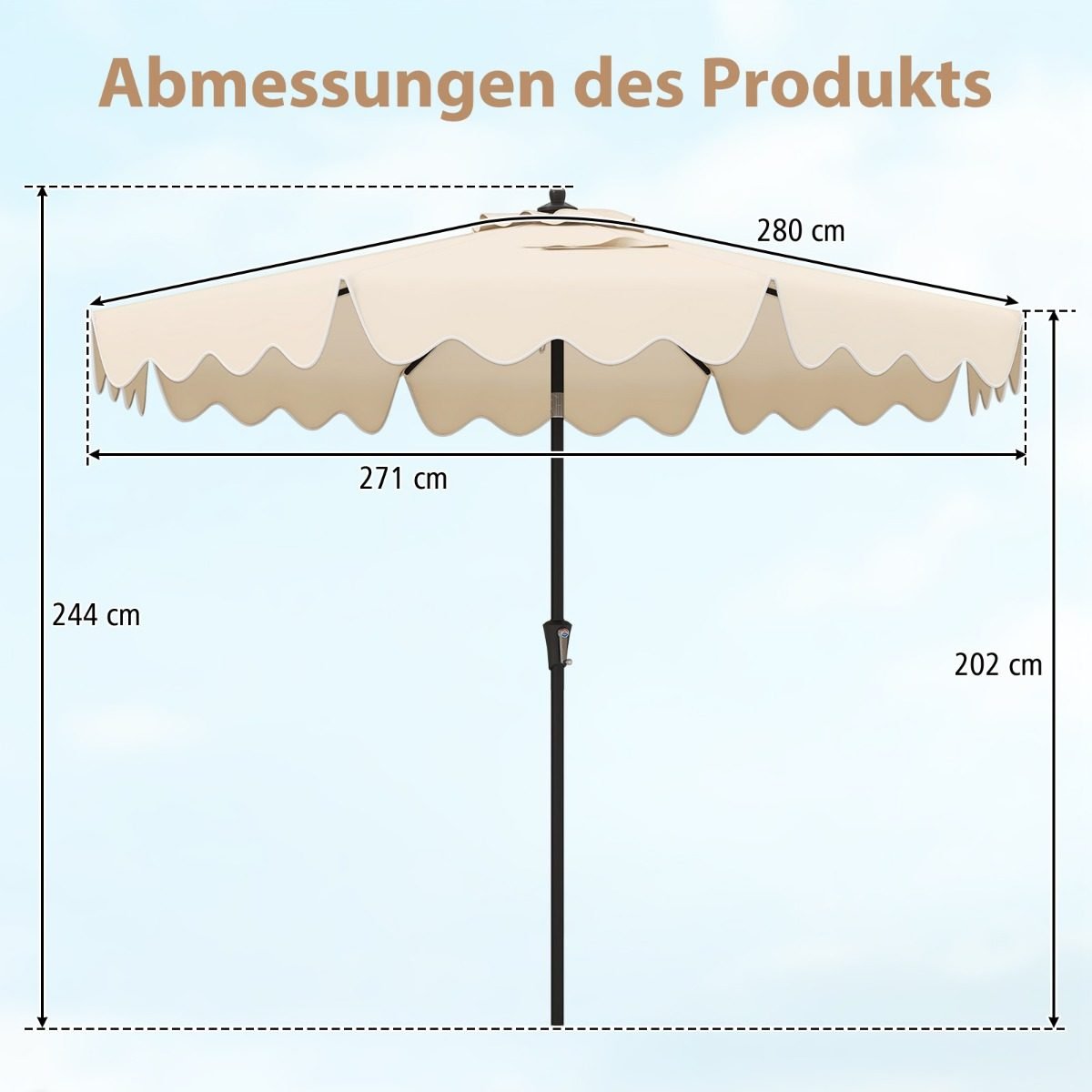 Sukurkite atpalaiduojančią oazę savo sode! Mūsų 280 cm skersmens terasos skėtis suteikia pakankamai apsaugos nuo saulės jūsų lauko baldams ir sukuria jaukią erdvę poilsiui. Lengvai reguliuojamas pakreipimo mechanizmas ir patogi rankena užtikrina optimalų komfortą. Unikalus dizainas su banguotais kraštais jūsų lauko erdvei suteiks elegancijos.