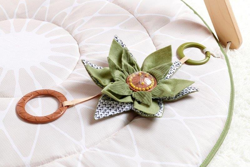 Dvigubas paminkštintas, minkštas mokomasis kilimėlis su žaislais, pagamintas iš aukštos kokybės medžiagų, prijungtas prie medinio stovo, nuimamas ir aprūpintas žaviais pakabukais. Kiekvieną pakabuką galima nuimti, perkelti, o stovą galima atskirti nuo kilimėlio. Į komplektą su kilimėliu įeina atvirukai su mėnesiais, kurie padės lengviau nufotografuoti pirmųjų kūdikio metų nuotraukas ir sukurti žavingus suvenyrus. Kortelės gale yra patarimas apie vystymąsi, kuris padės daugiau sužinoti apie jūsų kūdikio vystymąsi šį mėnesį.