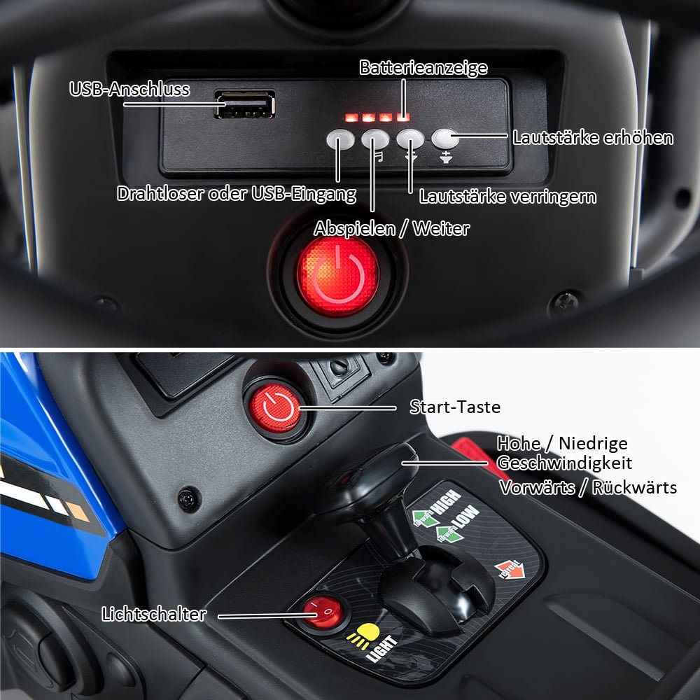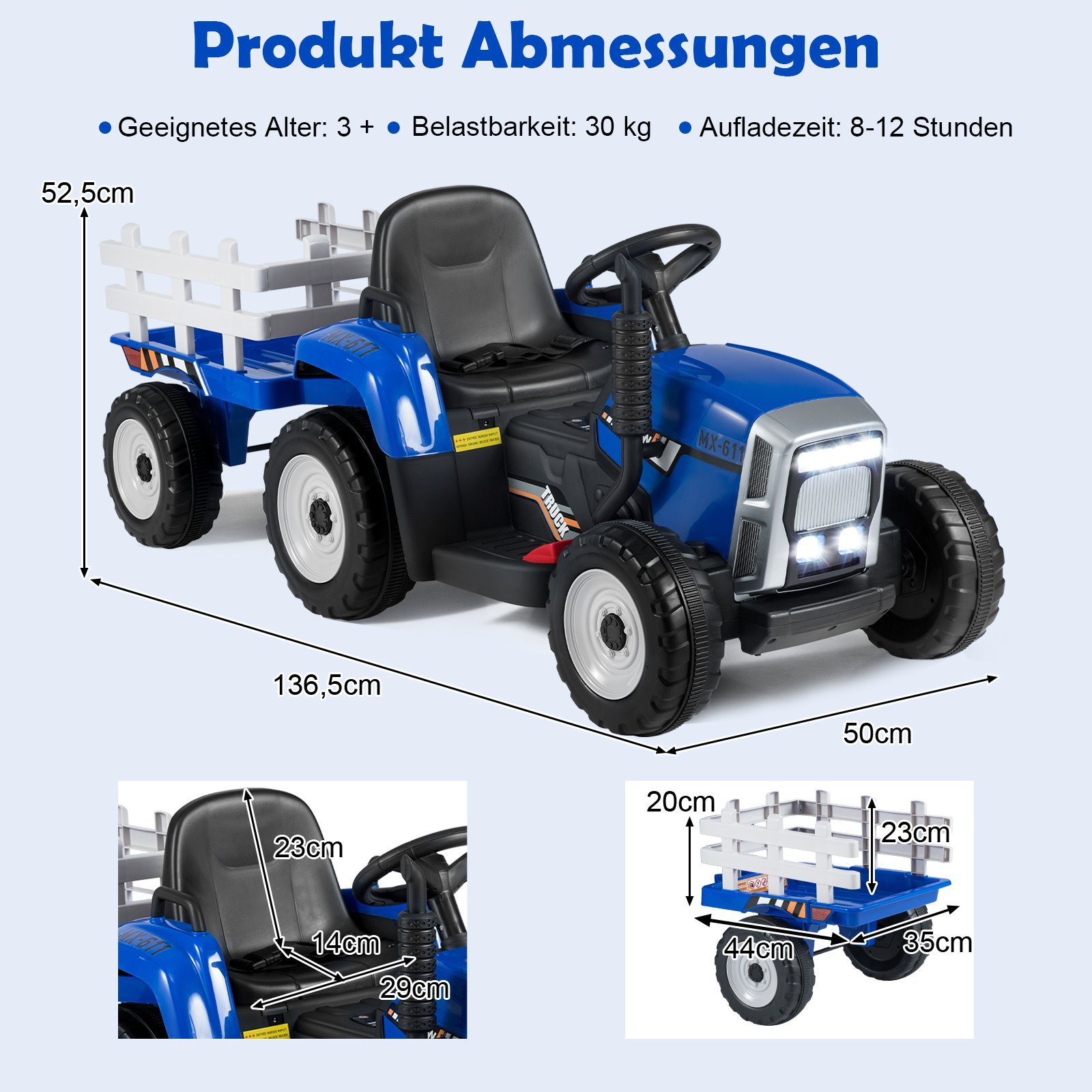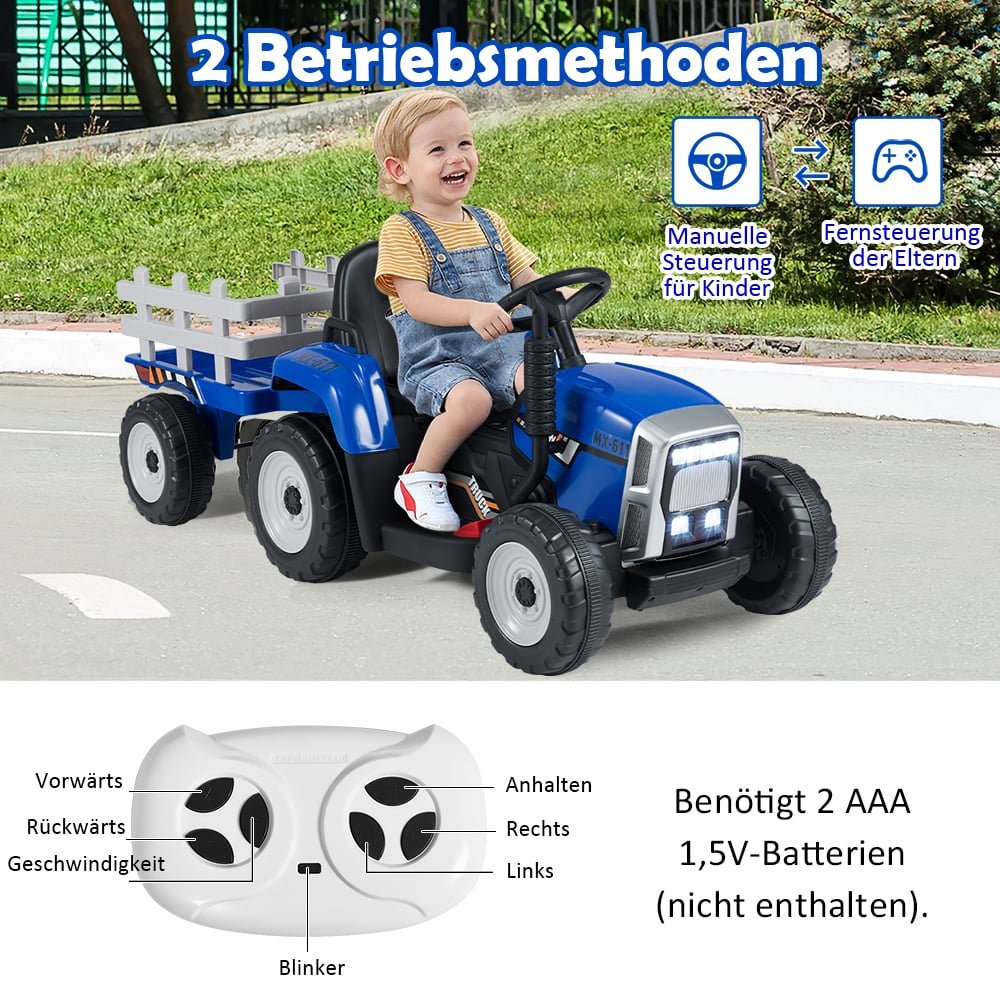 Šis vaikiškas traktorius su priekaba ne tik suteiks Jūsų vaikui daug džiaugsmo, bet ir padės lavinti koordinaciją bei pasitikėjimą savimi. Tėvai gali valdyti traktorių naudodami 2,4G nuotolinio valdymo pultelį, o vaikai gali važiuoti savarankiškai. Traktorius sukurtas atsižvelgiant į saugumą ir komfortą, turi integruotą muziką ir „Bluetooth“ funkciją, kurios leis mėgautis maloniais pasivažinėjimais.