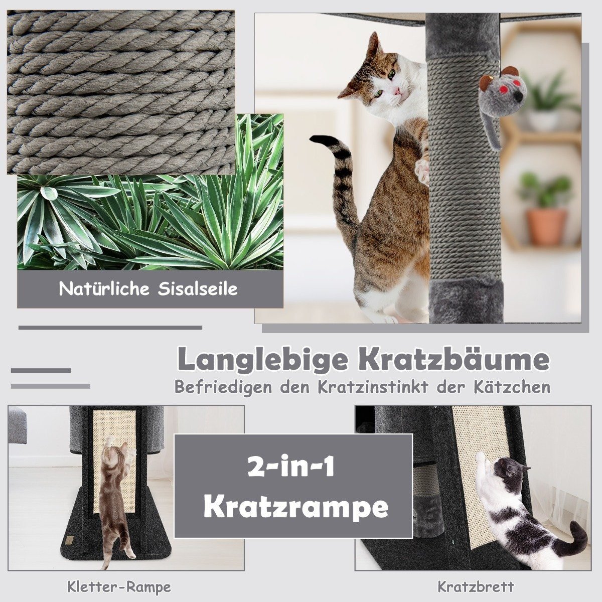 - Integruota draskymo lenta ir rampos padeda patenkinti natūralius kačių poreikius.