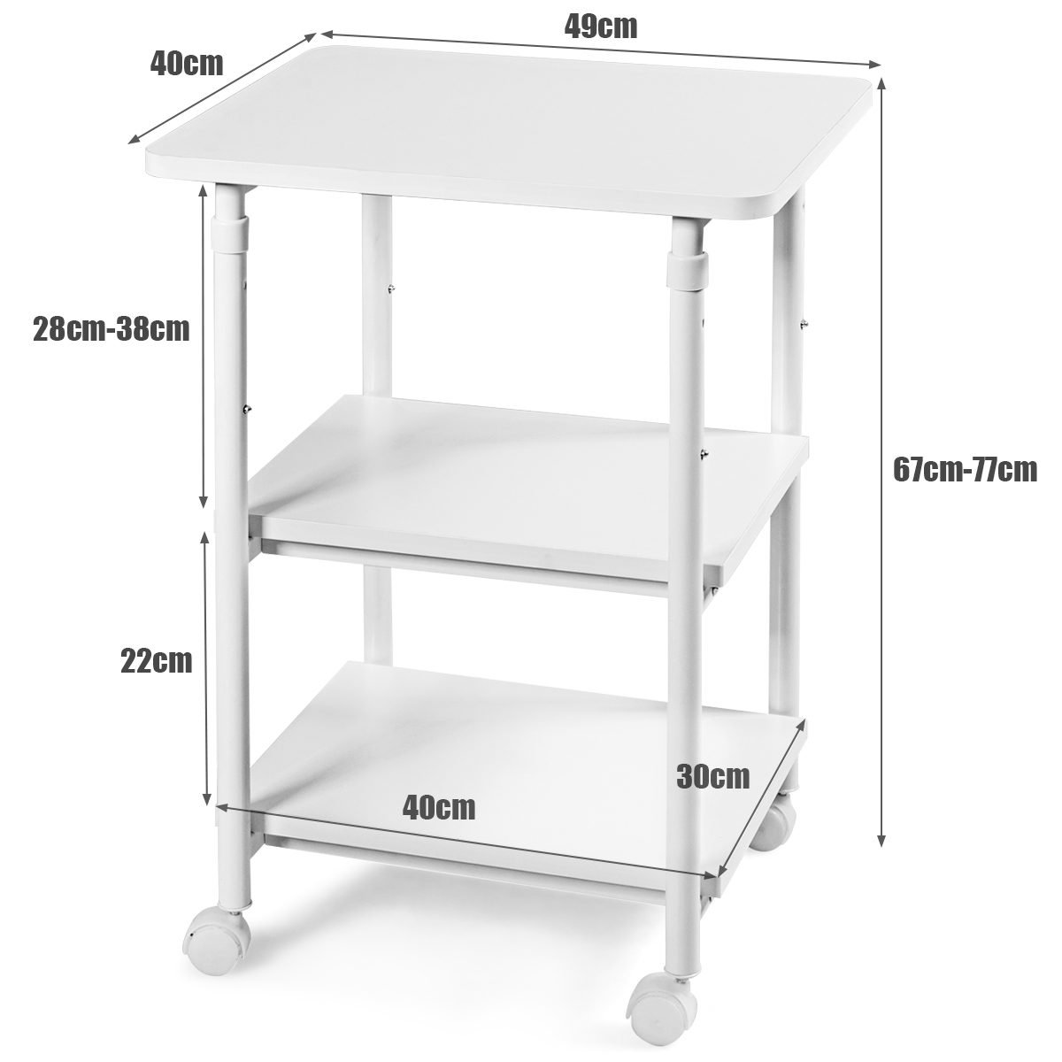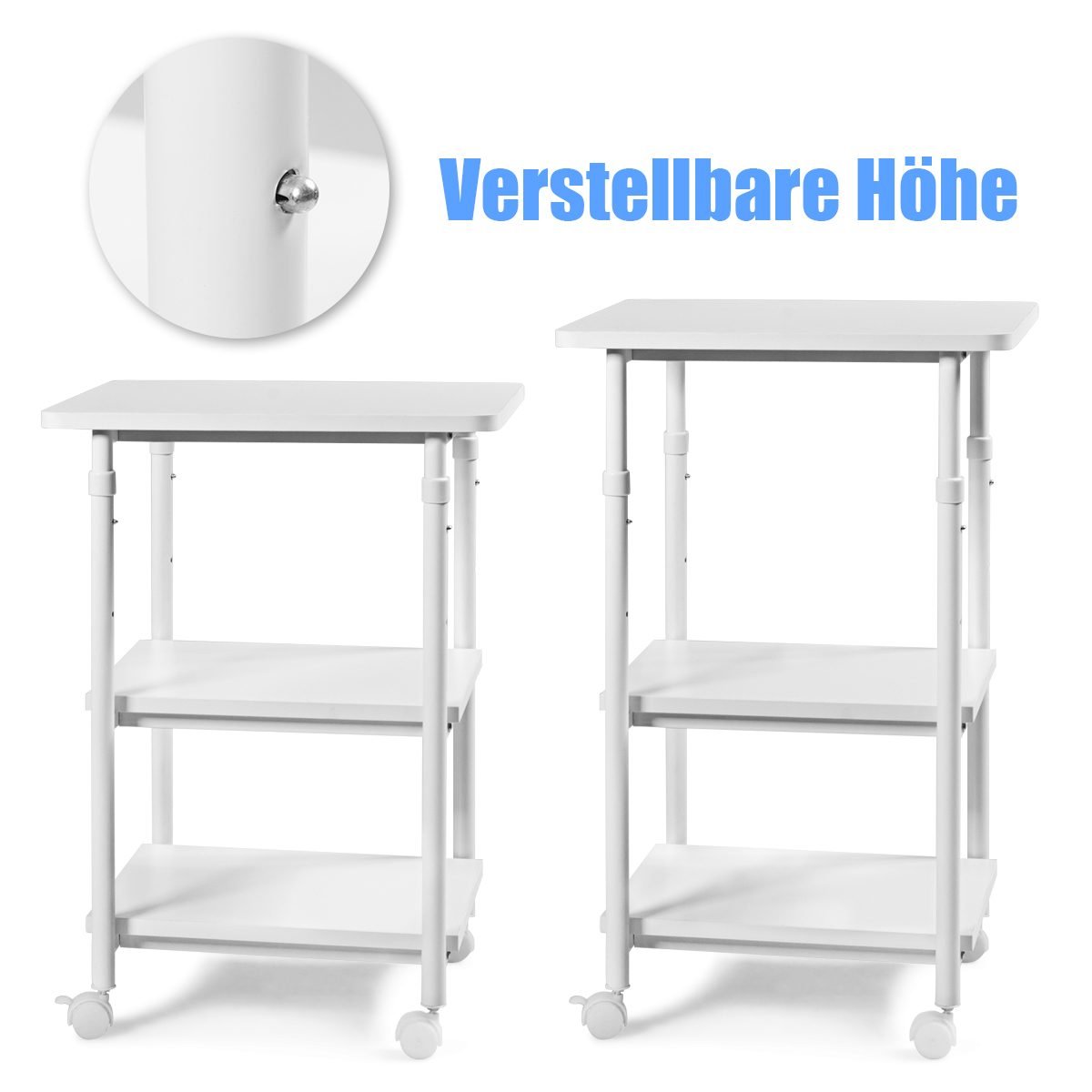Trijų aukštų reguliuojamo aukščio spausdintuvo stovas su ratukais (Balta)