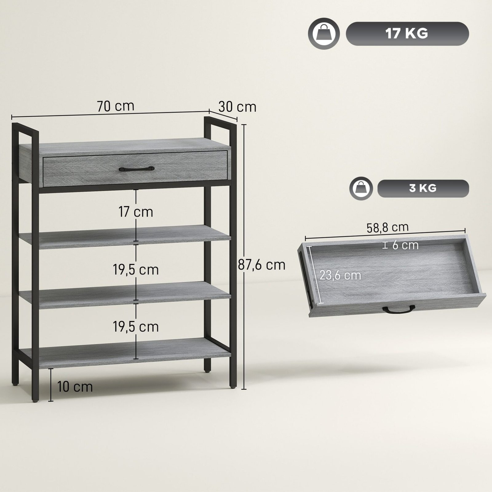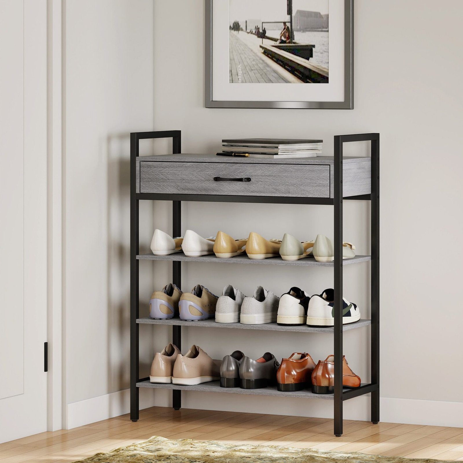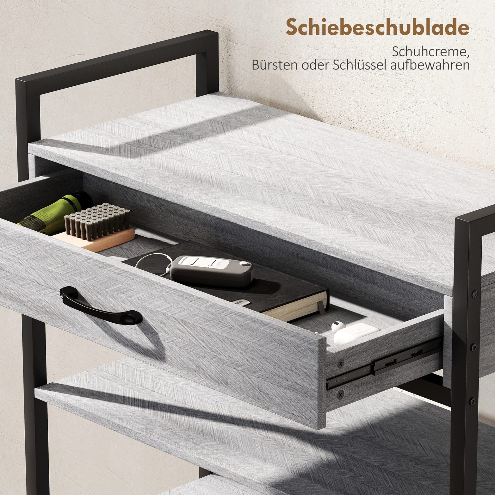 ✔ Praktiškas batų lentynos stalčius tvarkingai laiko batų priedus ir smulkius daiktus po ranka.