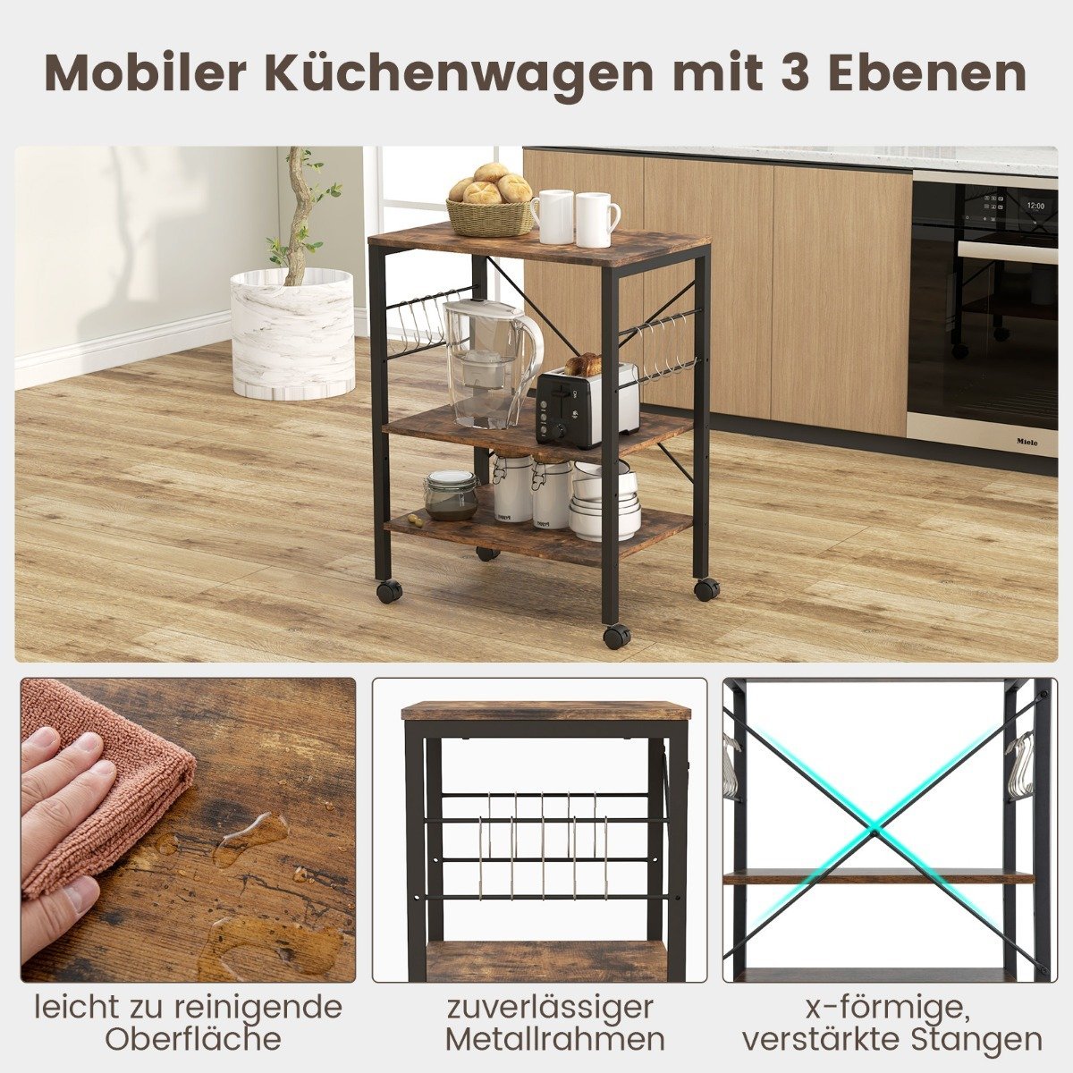Trijų lygių virtuvės vežimėlis su kabliukais (Ruda)