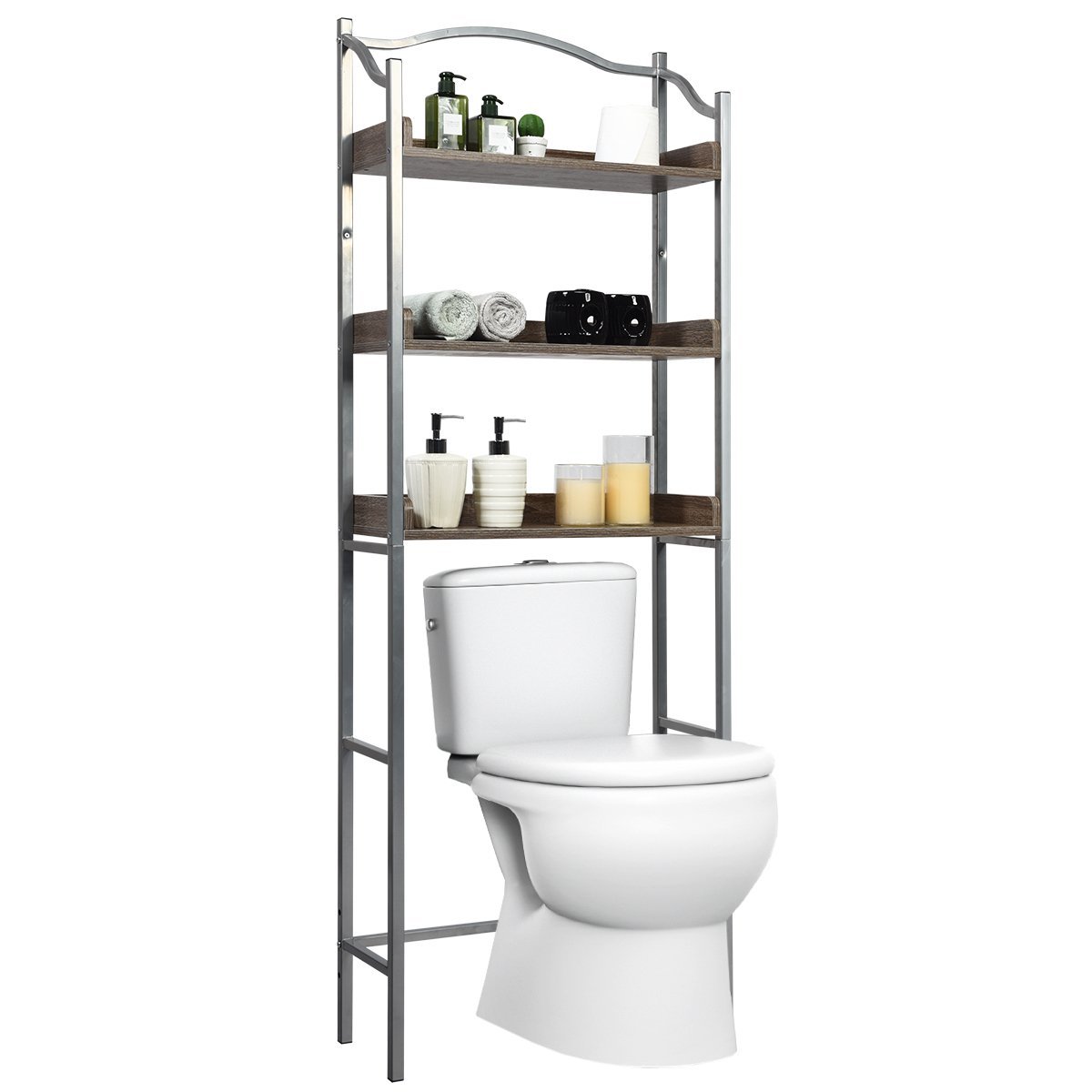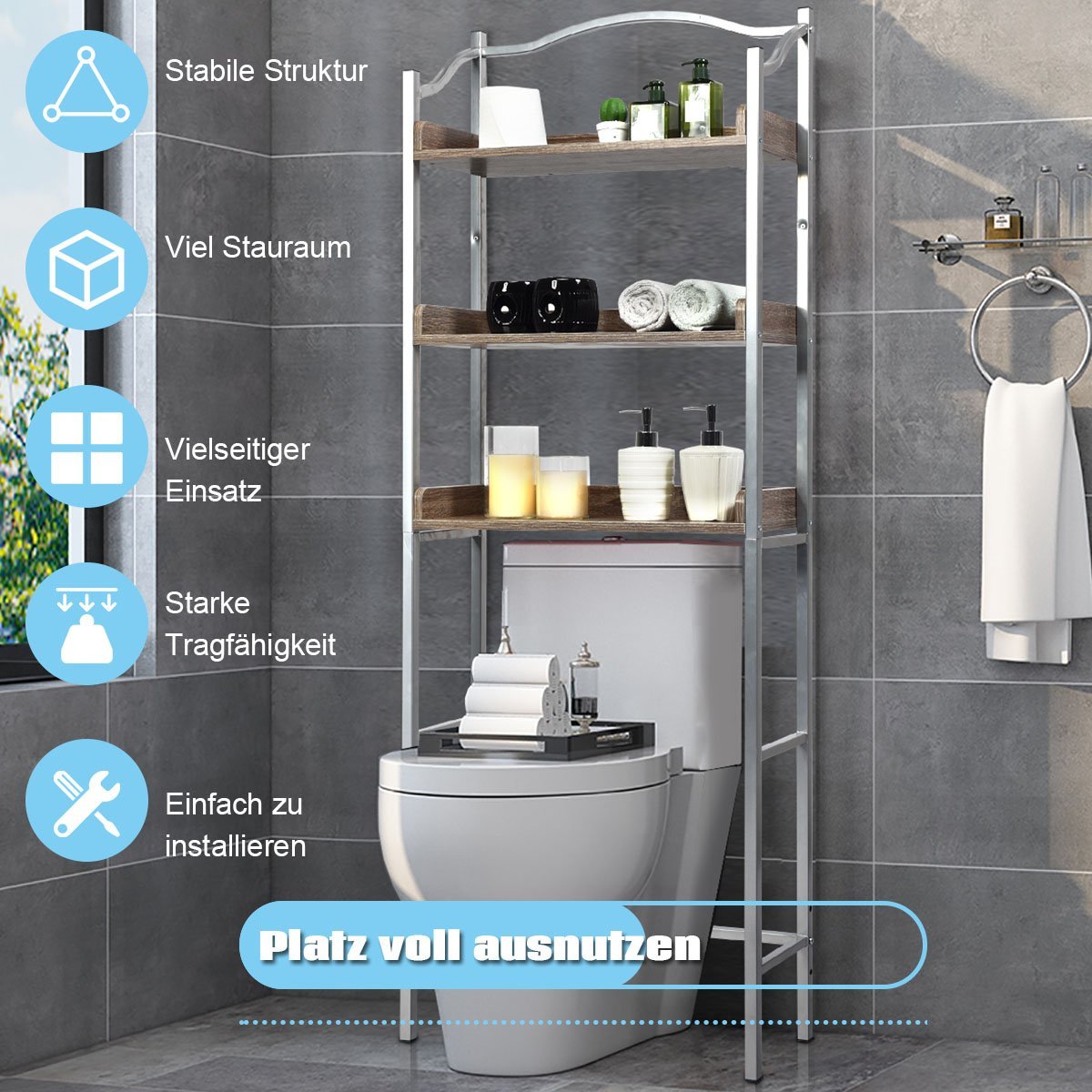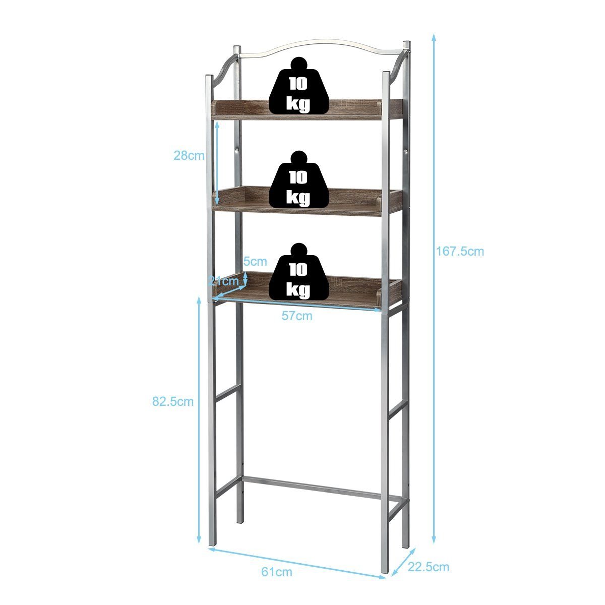 Optimizuokite savo vonios kambario erdvę su šia funkcionalia ir kompaktiška lentyna virš unitazo. Pagaminta iš aukštos kokybės medžio drožlių plokštės ir tvirto metalinio rėmo, ji garantuoja ilgaamžiškumą ir stabilumą.