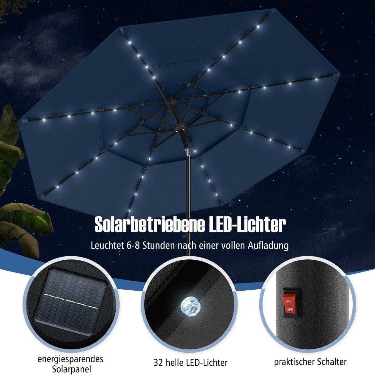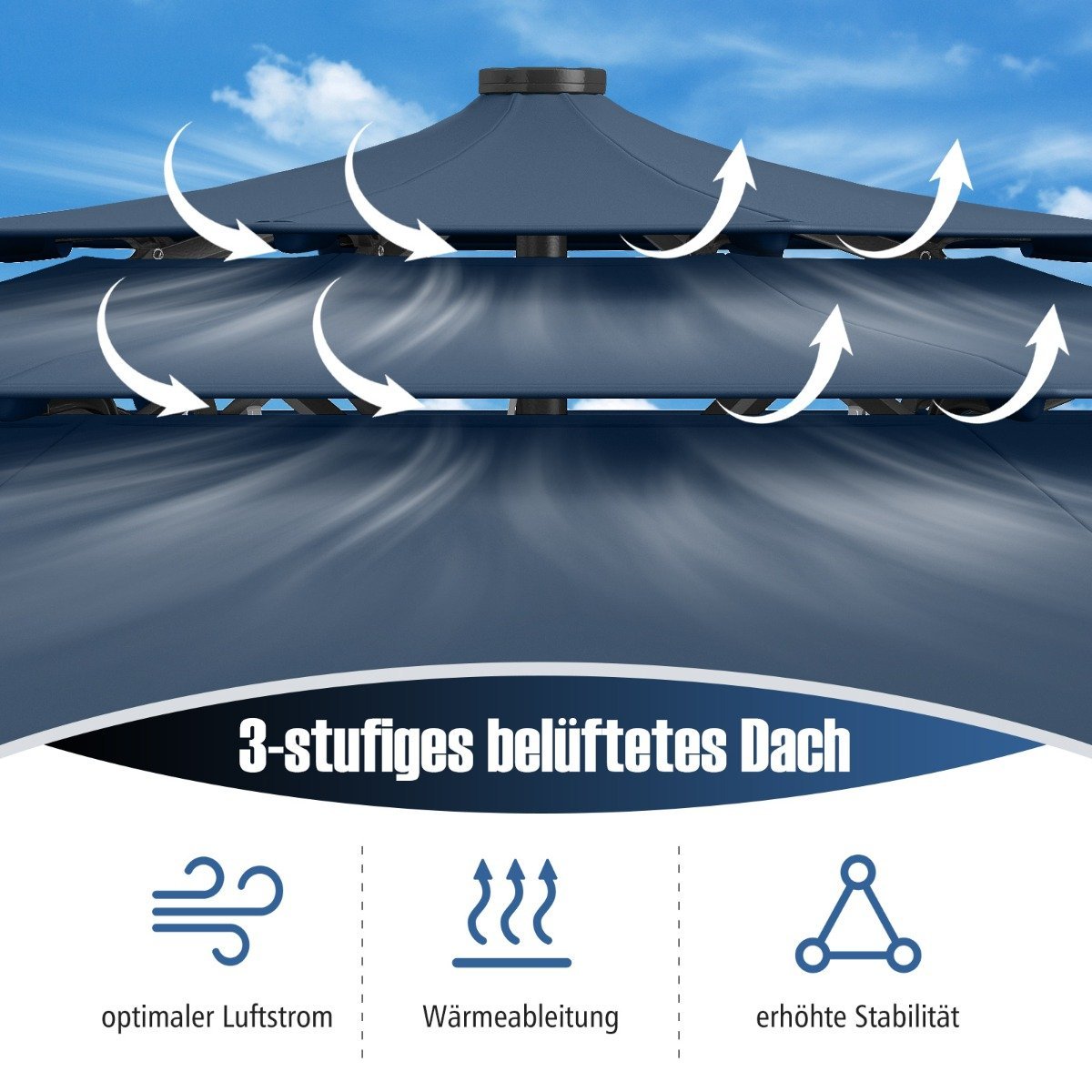 Trijų pakopų skėtis su šoninio kampo reguliavimu ir rankenėle (Tamsiai mėlyna)