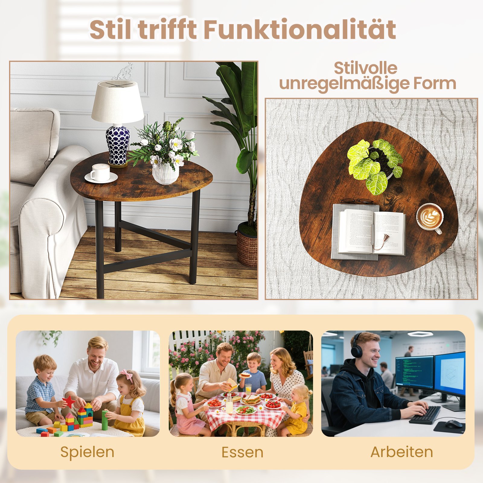 Atraskite tobulą stiliaus ir funkcionalumo derinį su šiuo unikaliu kavos staliuku. Jo išskirtinis trikampis dizainas, medienos rašto apdaila ir tvirtos metalinės kojos suteikia elegancijos ir stabilumo jūsų svetainei. Šis staliukas taps ne tik praktiška vieta kavos puodeliui ar dekoracijoms, bet ir patraukliu akcentu, puikiai tinkančiu tiek moderniems, tiek kompaktiškiems interjerams.