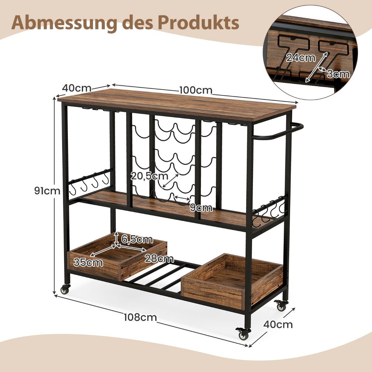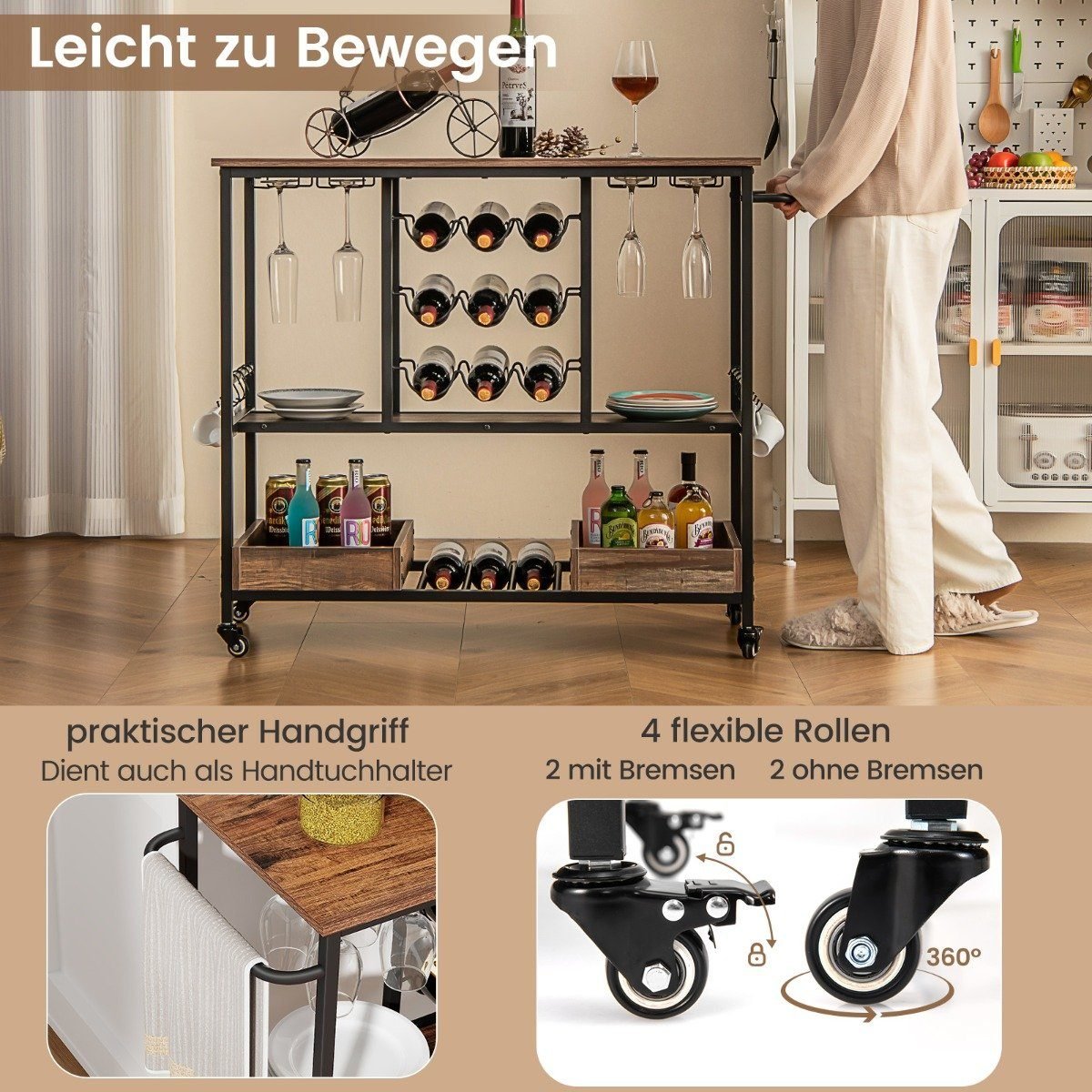 Praktiška ir stilinga Jūsų namų puošmena – šis trivietis virtuvės vežimėlis ant ratukų padės sutvarkyti daiktus ir suteiks Jūsų interjerui elegancijos. Puikiai tiks vyno kolekcijai laikyti ir patogiai patiekti gėrimus svečiams.