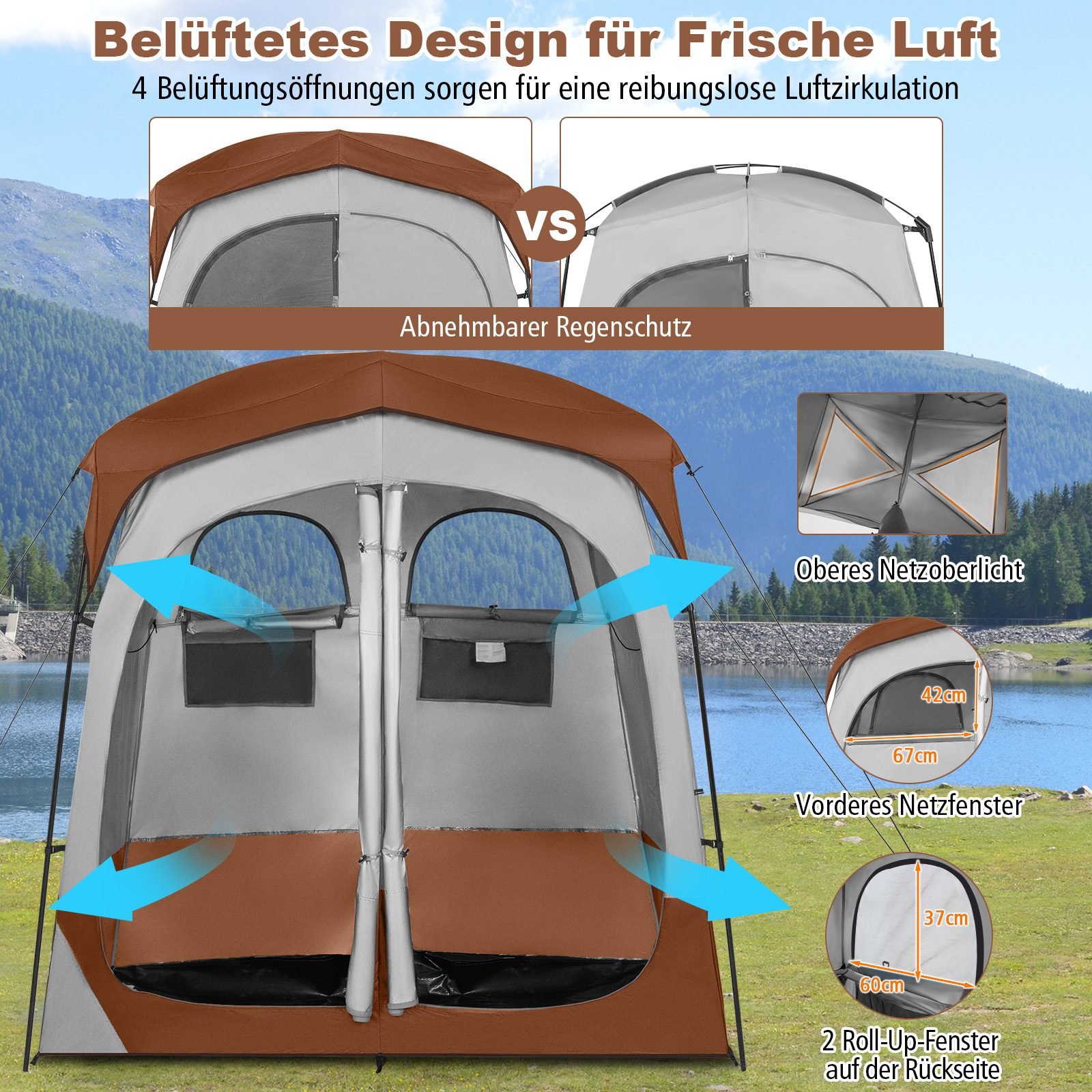 Užtikrinkite savo privatumą gamtoje su šia erdvia ir funkcionalia dviejų skyrių palapine. Ji idealiai tinka naudoti kaip dušo kabina, persirengimo kambarys ar tualetas gamtoje. Nesudėtingas surinkimas ir patogus transportavimas leis mėgautis komfortu bet kur.