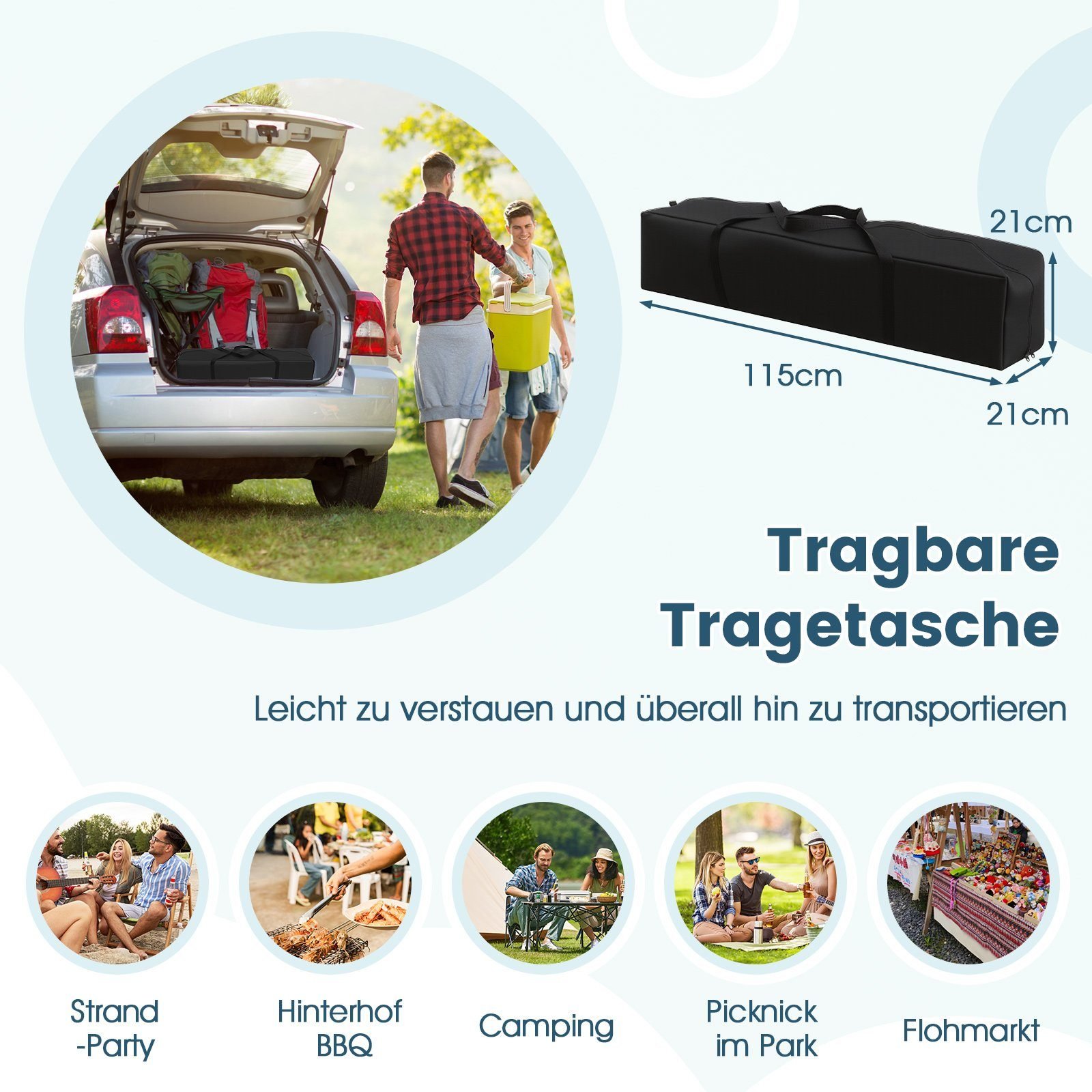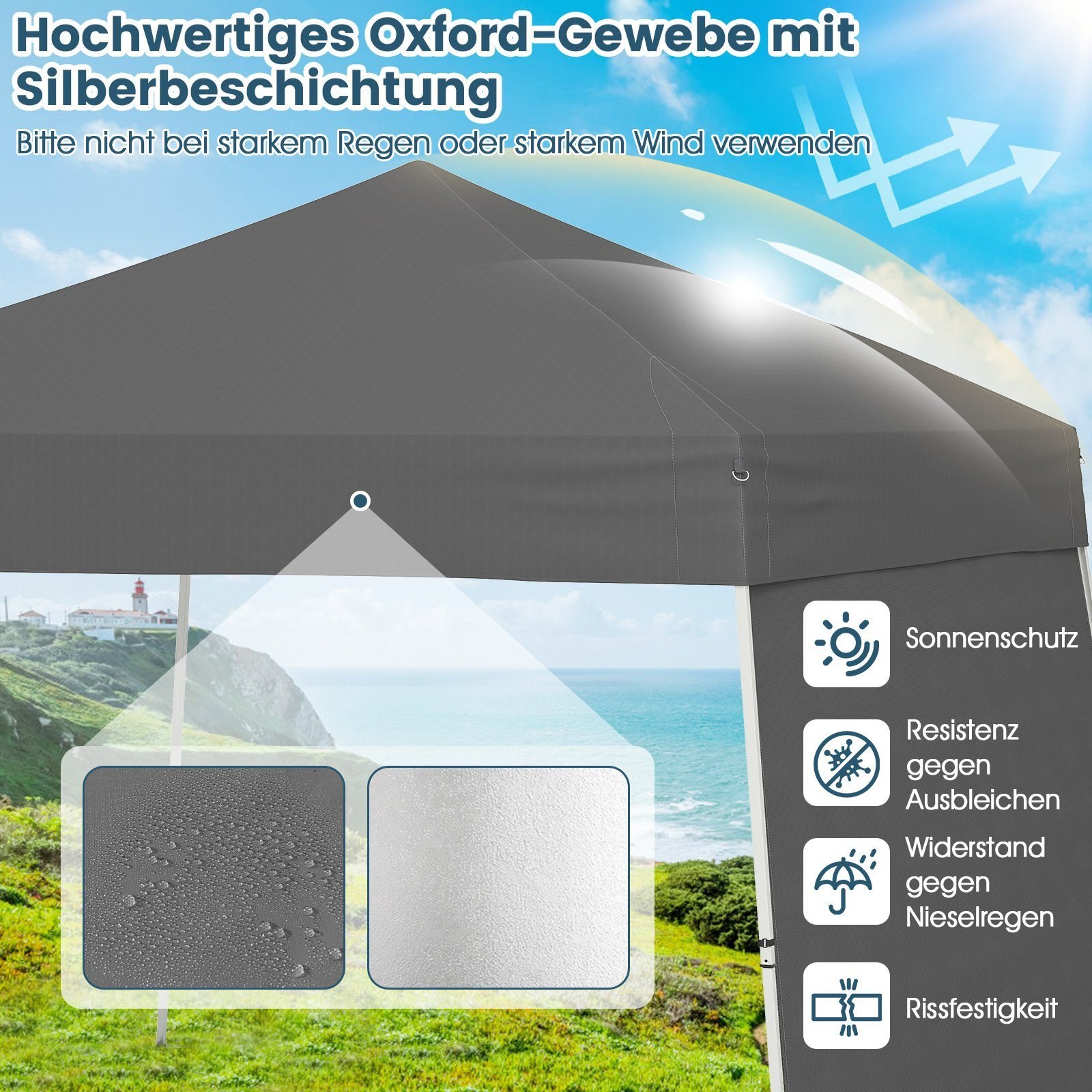 - Pagamintas iš aukštos kokybės, UV spinduliams ir lengvam lietui atsparaus audinio.